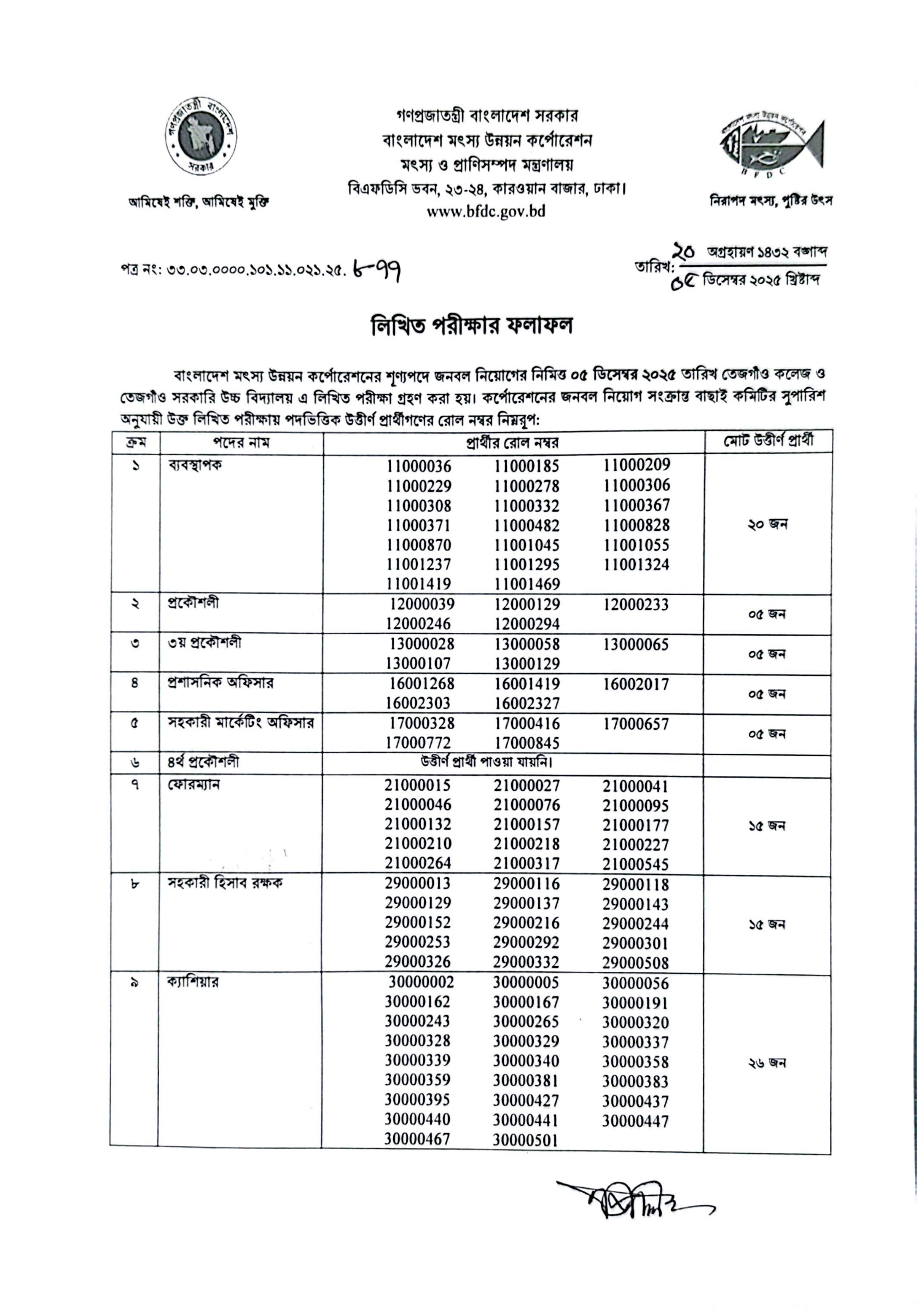 বাংলাদেশ মৎস্য উন্নয়ন কর্পোরেশনের বিভিন্ন শূন্যপদে জনবল নিয়োগের লক্ষ্যে অনুষ্ঠিত লিখিত পরীক্ষার ফলাফল প্রকাশিত হয়েছে। গত ০৫ ডিসেম্বর ২০২৫ তারিখে তেজগাঁও কলেজ ও তেজগাঁও সরকারি উচ্চ বিদ্যালয়ে এই পরীক্ষা অনুষ্ঠিত হয়।