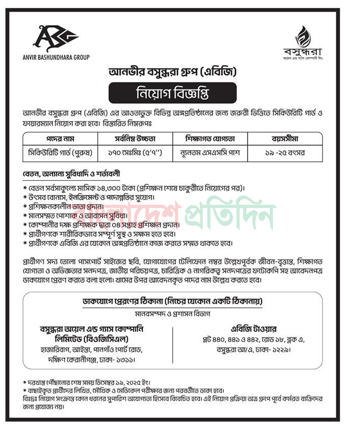 আনভির বসুন্ধরা গ্রুপ (এবিজি)-এর বিভিন্ন অঙ্গপ্রতিষ্ঠানসমূহের জন্য জরুরি ভিত্তিতে নিম্নলিখিত পদে জনবল নিয়োগ করা হবে।