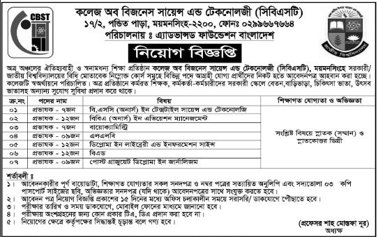 কলেজ অব বিজনেস সায়েন্স এন্ড টেকনোলজি (সিবিএসটি)ঠিকানা: ১৭/২, পন্ডিত পাড়া, ময়মনসিংহ-২২০০পরিচালনায়: অ্যাডভান্সড ফাউন্ডেশন বাংলাদেশ