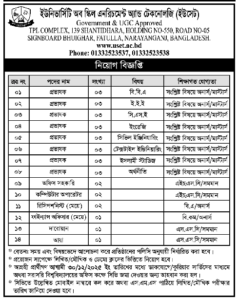 - আবেদনের শেষ তারিখ: আগ্রহী প্রার্থীরা ৩০/১২/২০২৫ তারিখের মধ্যে ডাকযোগে/কুরিয়ার সার্ভিসের মাধ্যমে অথবা সরাসরি বিশ্ববিদ্যালয়ের অফিস কক্ষে সিভি জমা দেওয়ার জন্য আহ্বান করা হয়েছে।