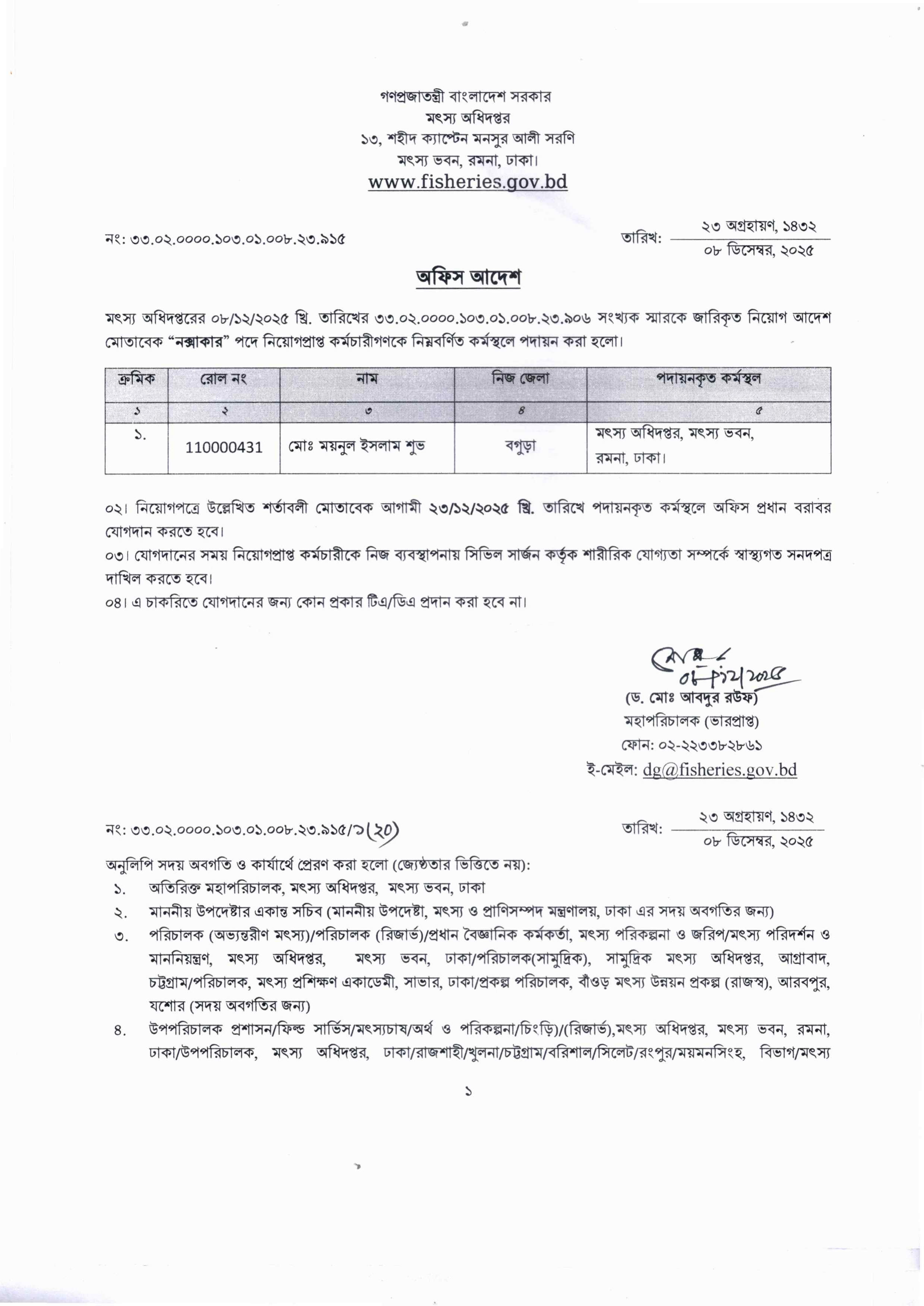 নিয়োগপ্রাপ্ত কর্মচারীদের আগামী ২৩/১২/২০২৫ তারিখের মধ্যে তাদের পদায়নকৃত কর্মস্থলে অফিস প্রধান বরাবর যোগদান করতে হবে।