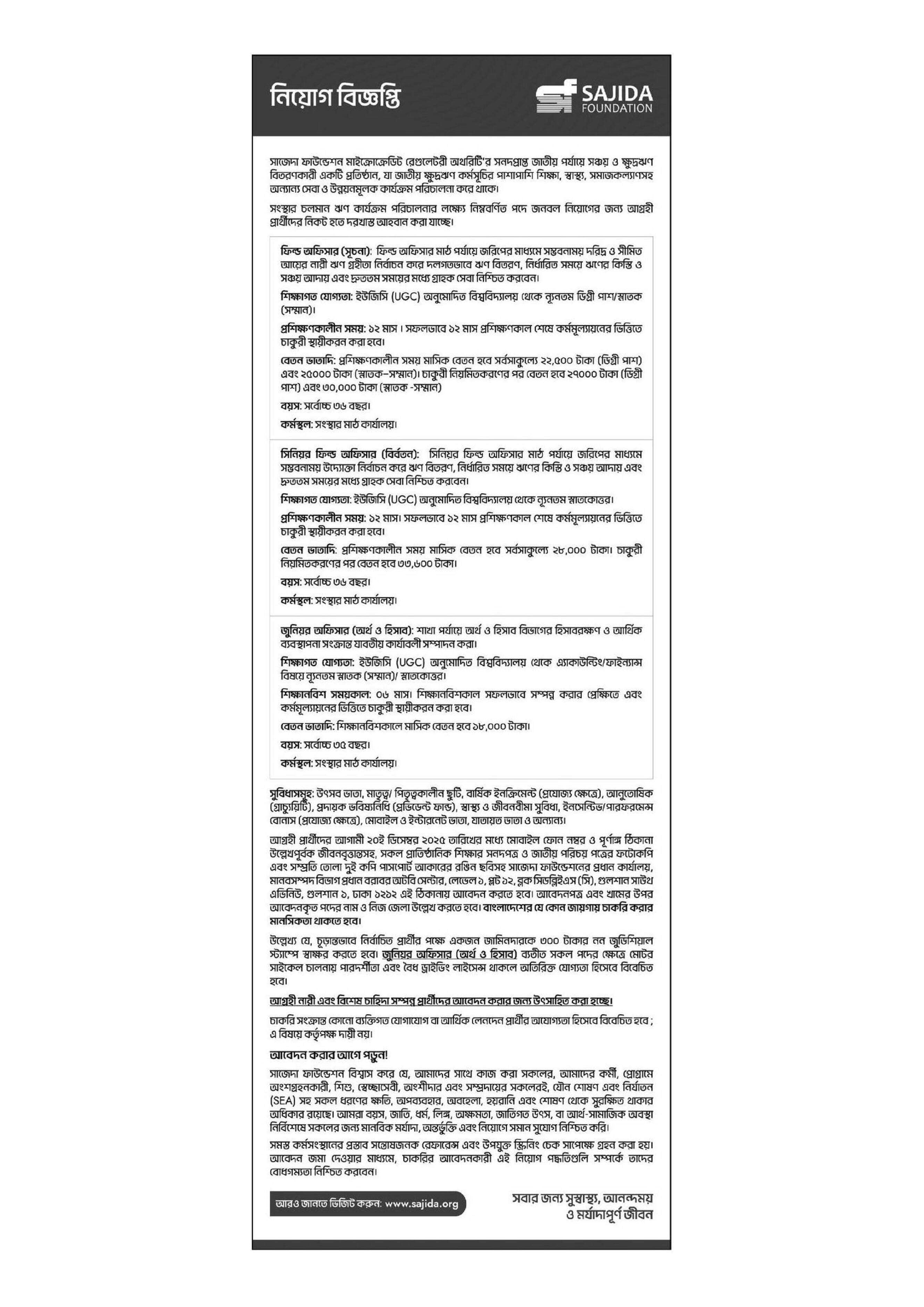 সাজেদা ফাউন্ডেশন তাদের চলমান ঋণ কার্যক্রম পরিচালনার জন্য একাধিক পদে জনবল নিয়োগের বিজ্ঞপ্তি প্রকাশ করেছে। আগ্রহী প্রার্থীরা নিম্নলিখিত পদসমূহে আবেদন করতে পারবেন: