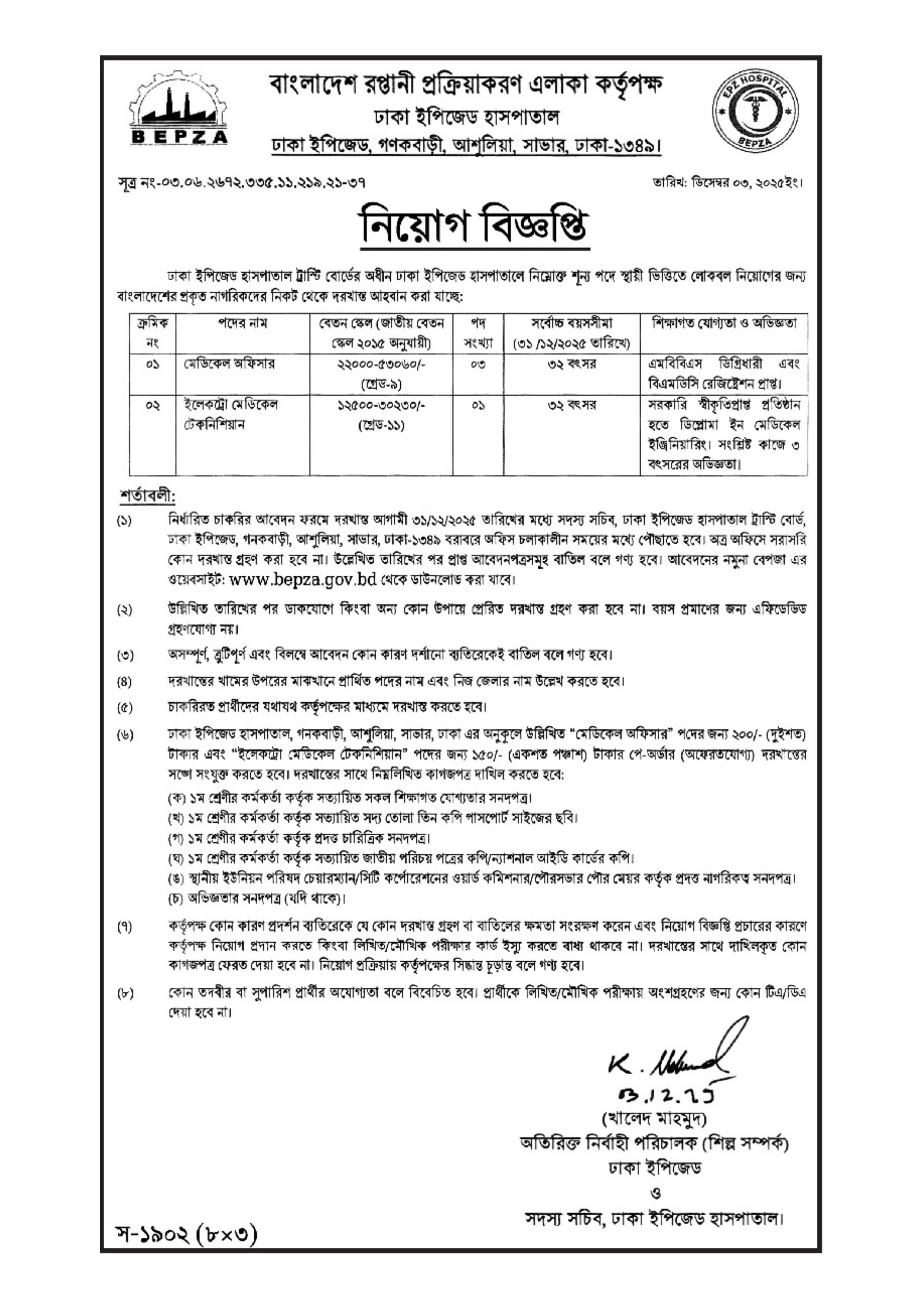বাংলাদেশ রপ্তানী প্রক্রিয়াকরণ এলাকা কর্তৃপক্ষ-এর অধীনস্থ ঢাকা ইপিজেড হাসপাতালে ০২টি পদে জনবল নিয়োগের জন্য বিজ্ঞপ্তি প্রকাশ করা হয়েছে। আগ্রহী ও যোগ্য প্রার্থীদের কাছ থেকে দরখাস্ত আহ্বান করা হচ্ছে।