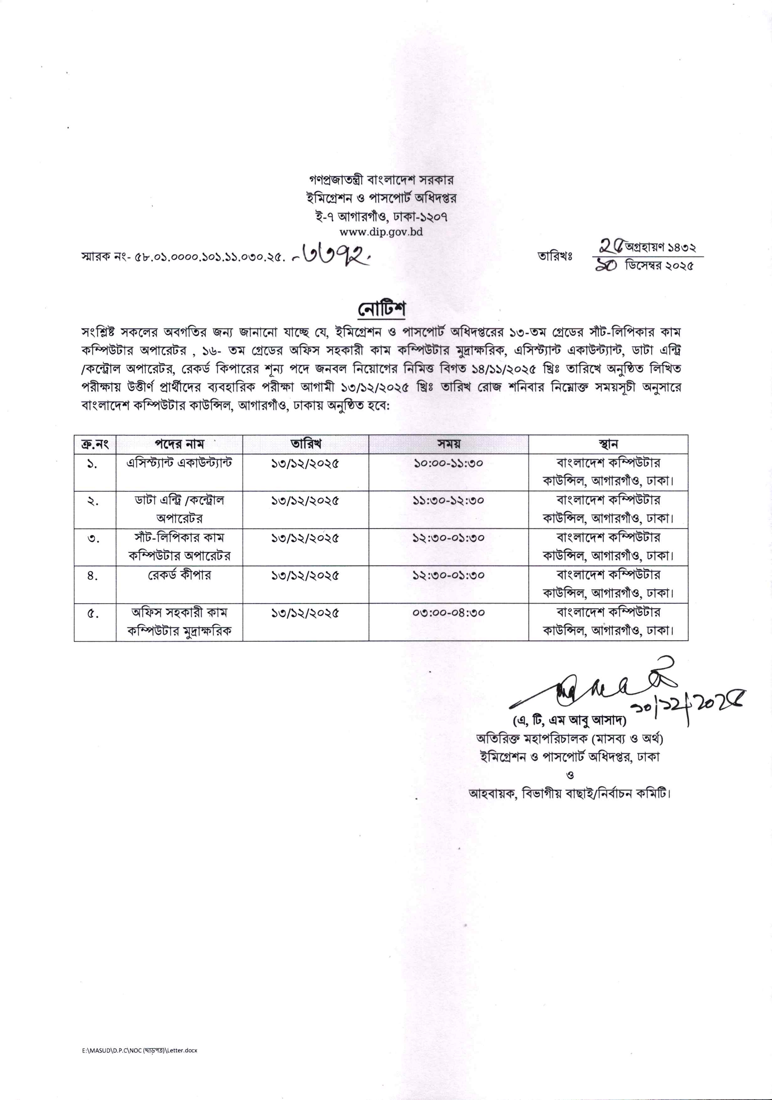 ইমিগ্রেশন ও পাসপোর্ট অধিদপ্তরের বিভিন্ন পদের লিখিত পরীক্ষায় উত্তীর্ণ প্রার্থীদের ব্যবহারিক পরীক্ষার সময়সূচী প্রকাশিত হয়েছে।
