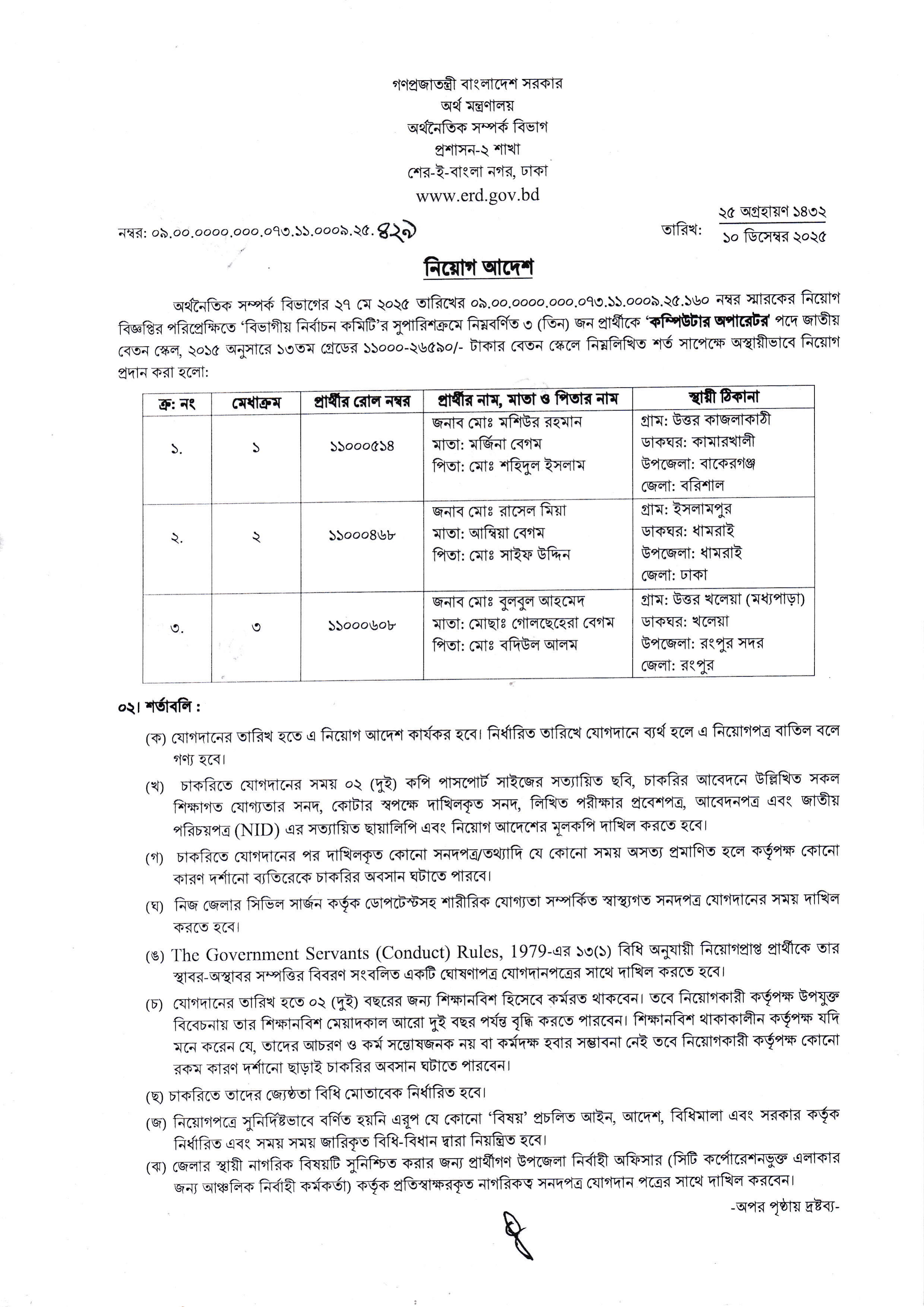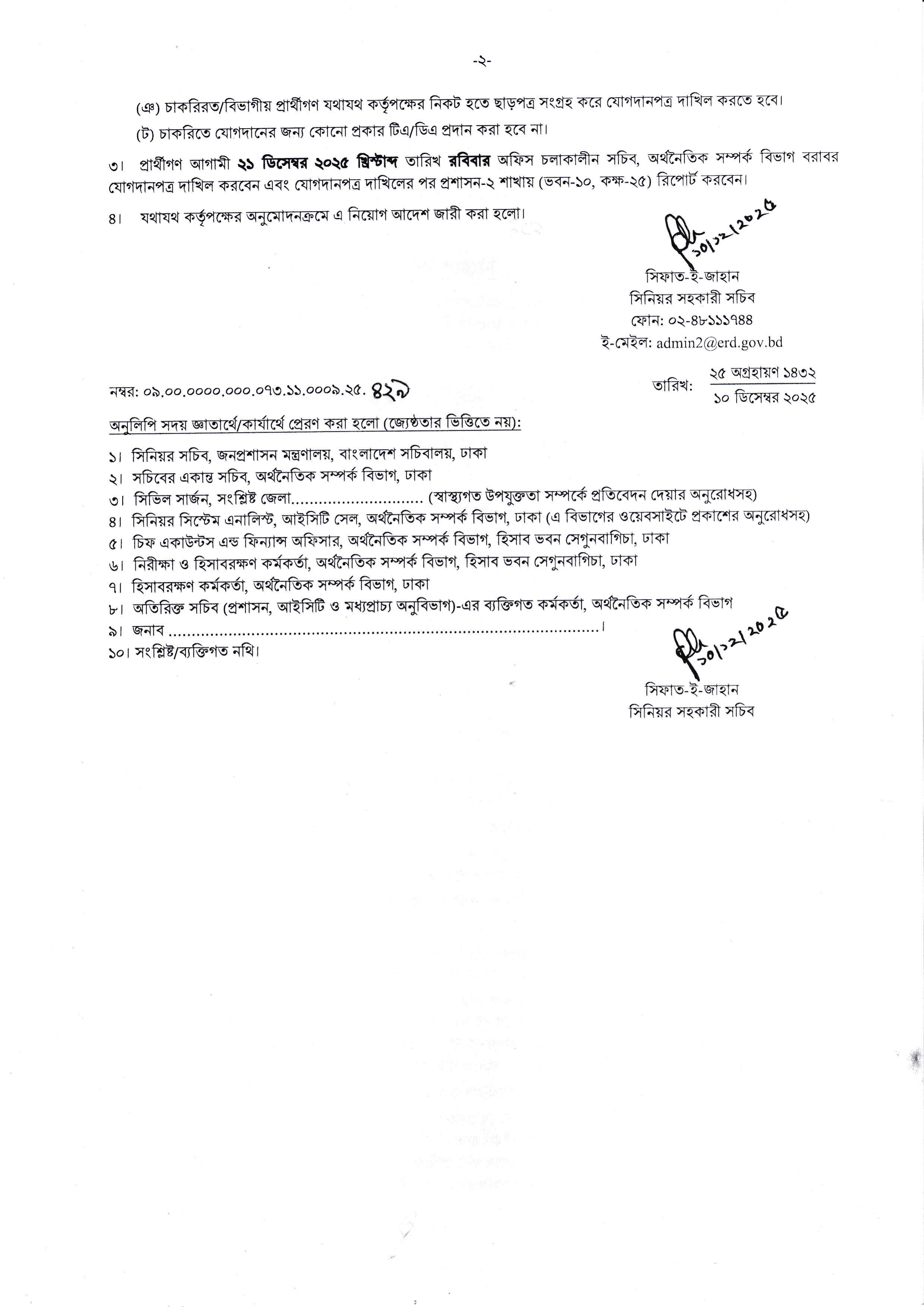 প্রার্থীগণকে আগামী ২১ ডিসেম্বর ২০২৫ খ্রিস্টাব্দ তারিখ রবিবার অফিস চলাকালীন সচিব, অর্থনৈতিক সম্পর্ক বিভাগ বরাবর যোগদানপত্র দাখিল করতে হবে এবং যোগদানপত্র দাখিলের পর প্রশাসন-২ শাখায় (ভবন-১০, কক্ষ-২৫) রিপোর্ট করতে হবে।