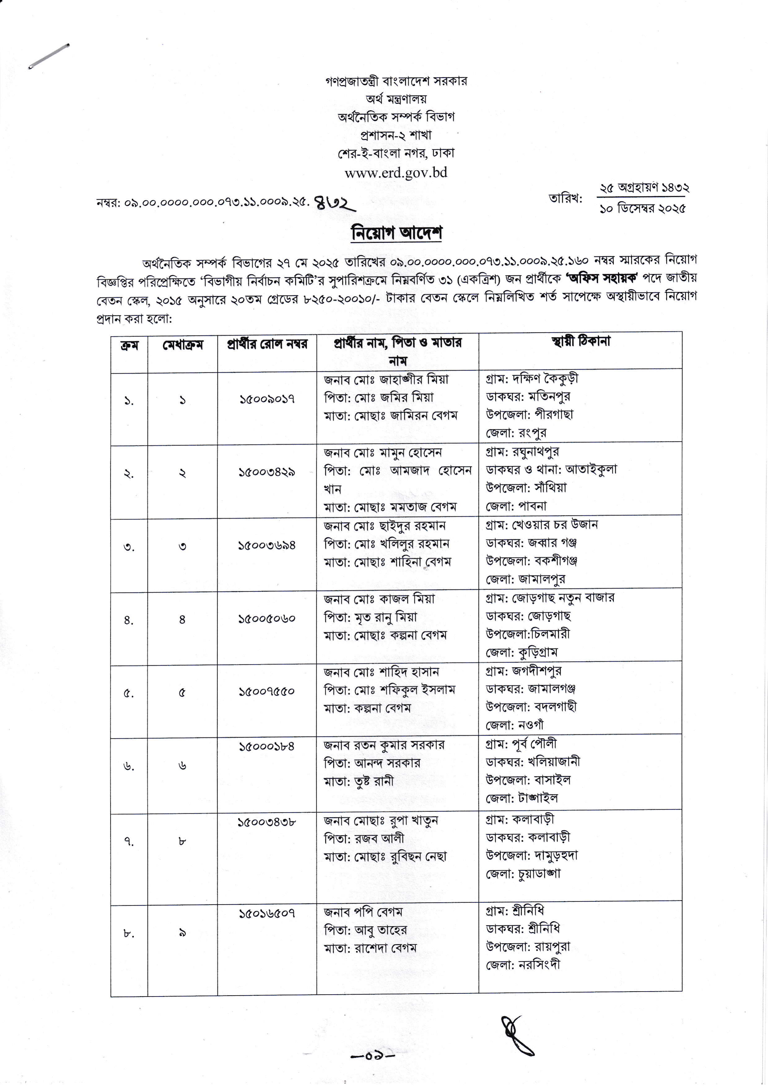 অর্থনৈতিক সম্পর্ক বিভাগ কর্তৃক অফিস সহায়ক পদে জনবল নিয়োগের নিয়োগ আদেশ প্রকাশিত হয়েছে। মোট ৩১ (একত্রিশ) জন প্রার্থীকে এই পদে অস্থায়ীভাবে নিয়োগ প্রদান করা হয়েছে।