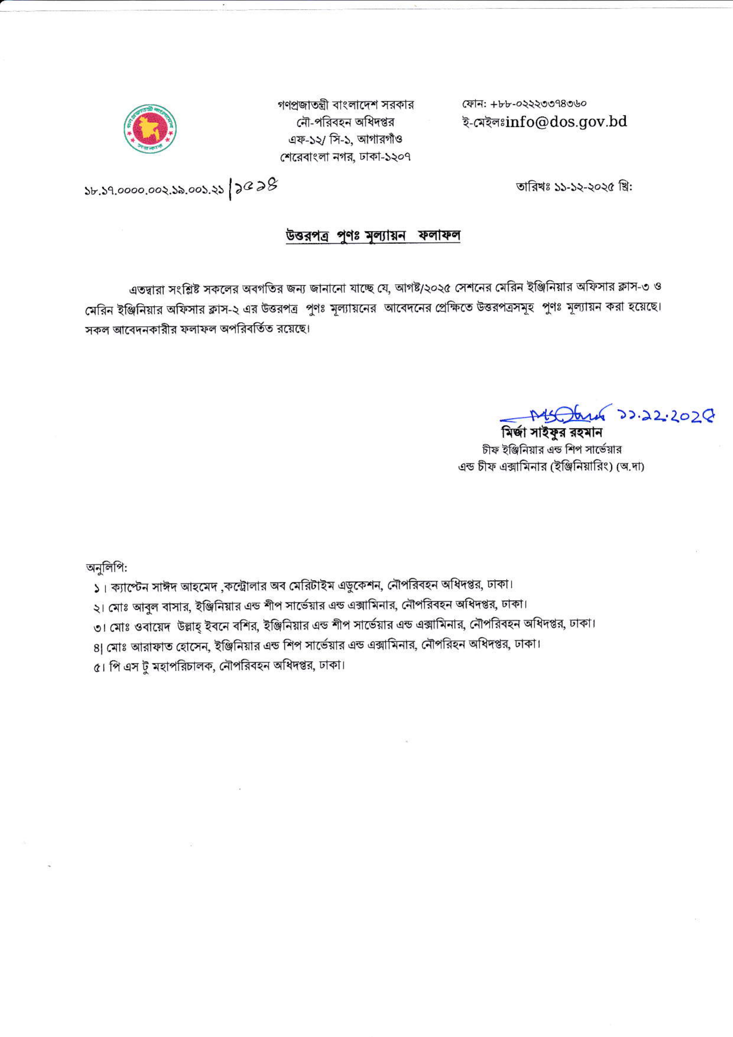 নৌ-পরিবহন অধিদপ্তরের মেরিন ইঞ্জিনিয়ার অফিসার ক্লাস-৩ এবং মেরিন ইঞ্জিনিয়ার অফিসার ক্লাস-২ পদের আগষ্ট/২০২৫ সেশনের উত্তরপত্র পুনঃমূল্যায়নের ফলাফল প্রকাশিত হয়েছে।