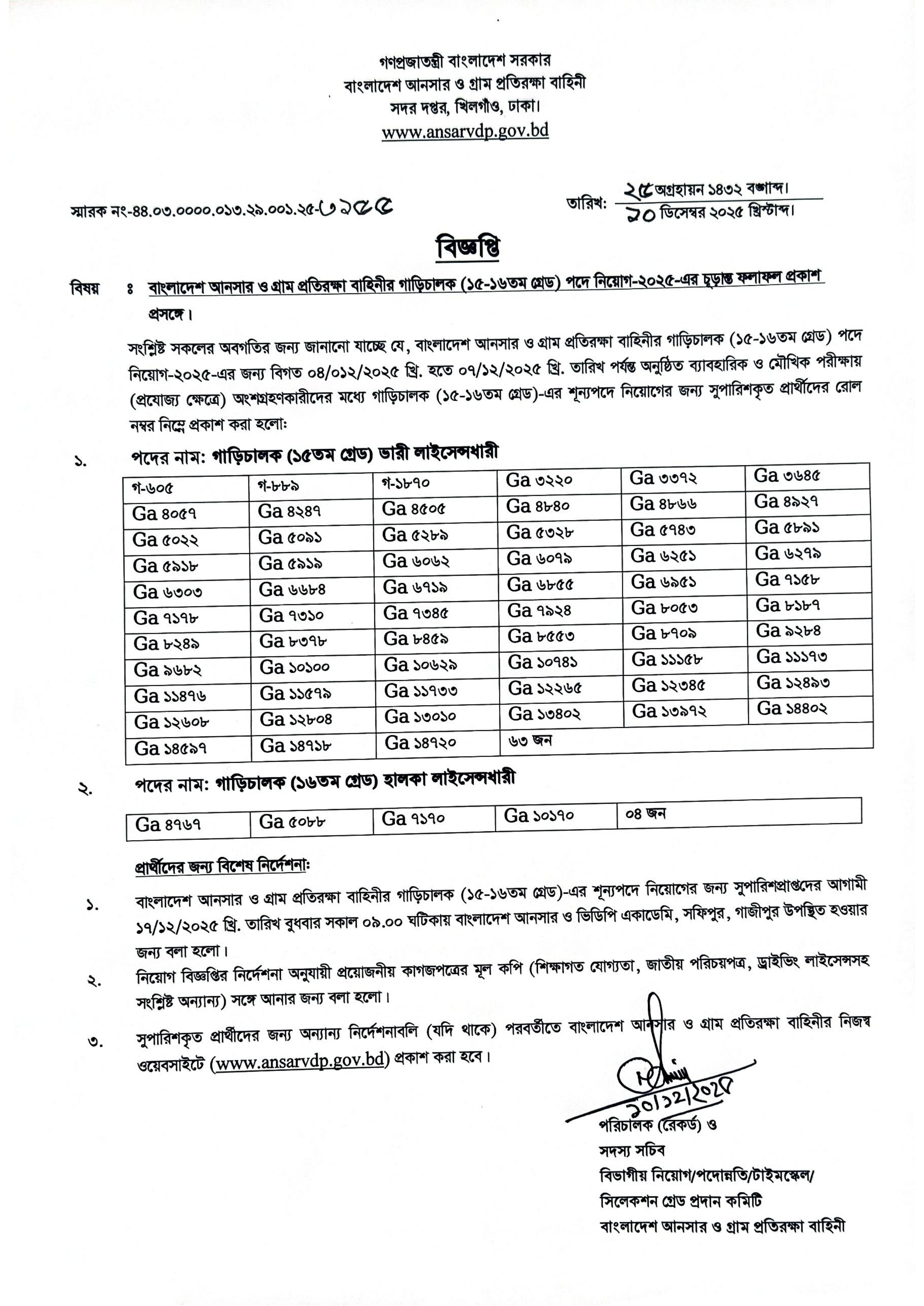 বাংলাদেশ আনসার ও গ্রাম প্রতিরক্ষা বাহিনীর গাড়িচালক (১৫-১৬তম গ্রেড) পদে নিয়োগ-২০২৫-এর চূড়ান্ত ফলাফল প্রকাশিত হয়েছে।