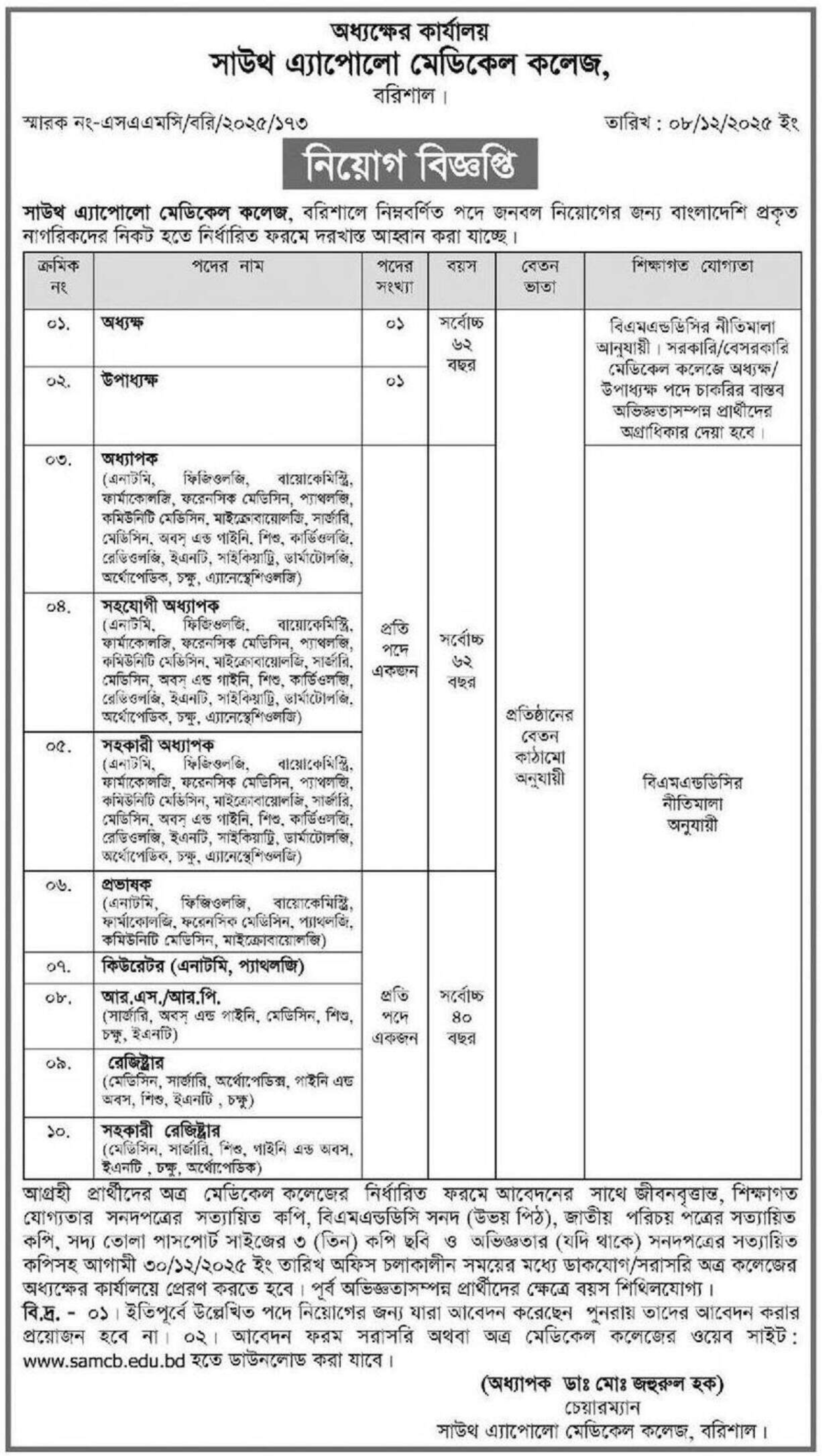 সাউথ এ্যাপোলো মেডিকেল কলেজ, বরিশাল জনবল নিয়োগের জন্য একটি নতুন বিজ্ঞপ্তি প্রকাশ করেছে। আগ্রহী ও যোগ্য বাংলাদেশি নাগরিকদের নিকট হতে নির্ধারিত ফরমে আবেদন আহ্বান করা হয়েছে।