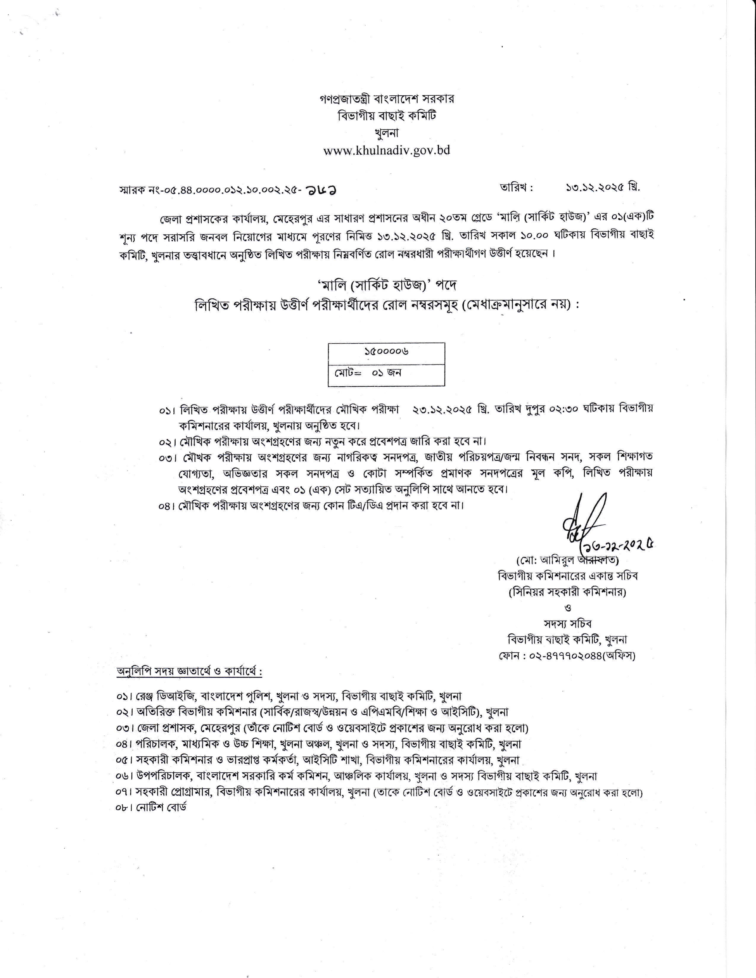 জেলা প্রশাসকের কার্যালয়, মেহেরপুর এর সাধারণ প্রশাসনের অধীন ২০তম গ্রেডে 'মালি (সার্কিট হাউজ)' পদের ০১ (এক)টি শূন্য পদে জনবল নিয়োগের জন্য গত ১৩.১২.২০২৫ খ্রি. তারিখে অনুষ্ঠিত লিখিত পরীক্ষার ফলাফল প্রকাশিত হয়েছে।