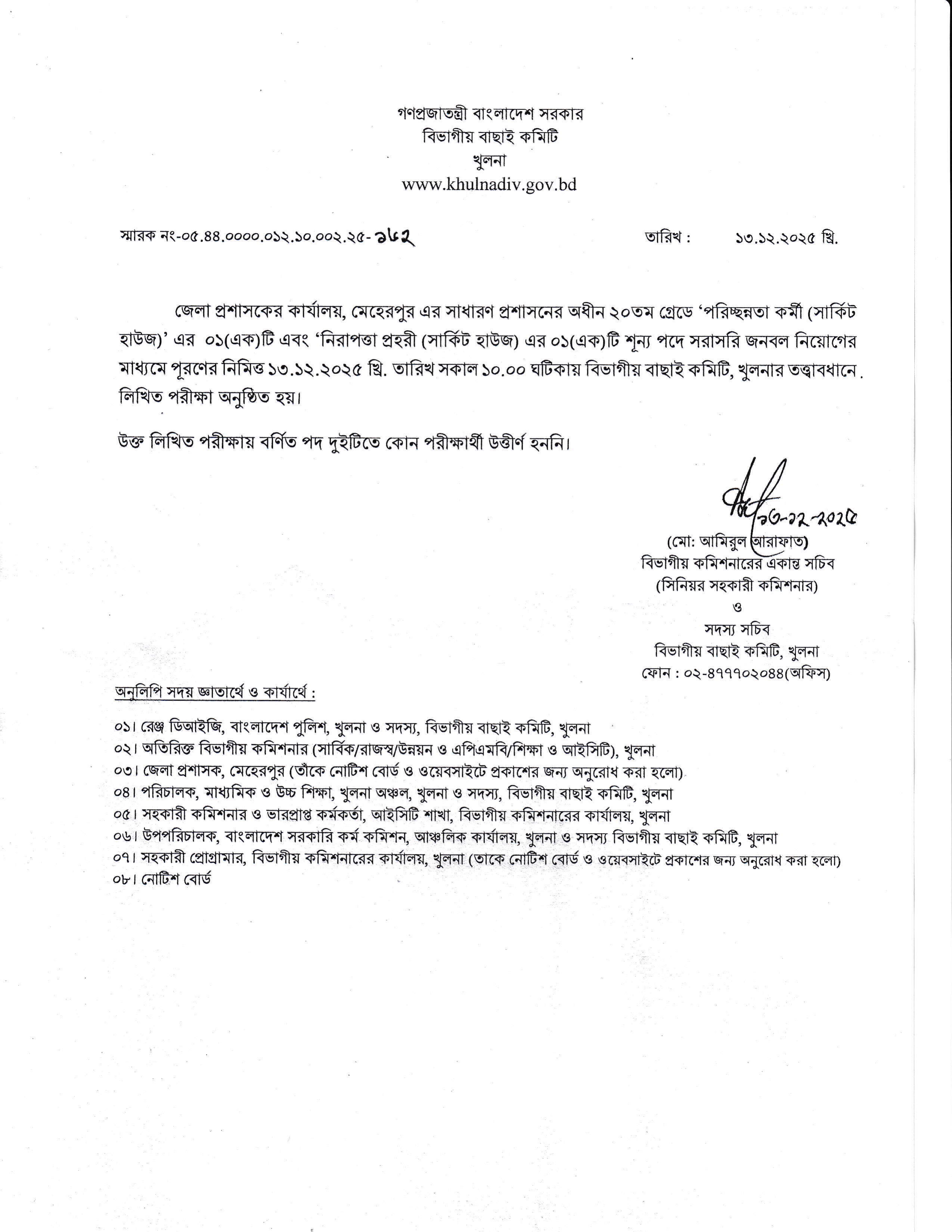 লিখিত পরীক্ষাটি ১৩.১২.২০২৫ খ্রি. তারিখে সকাল ১০.০০ ঘটিকায় বিভাগীয় বাছাই কমিটি, খুলনার তত্ত্বাবধানে অনুষ্ঠিত হয়।