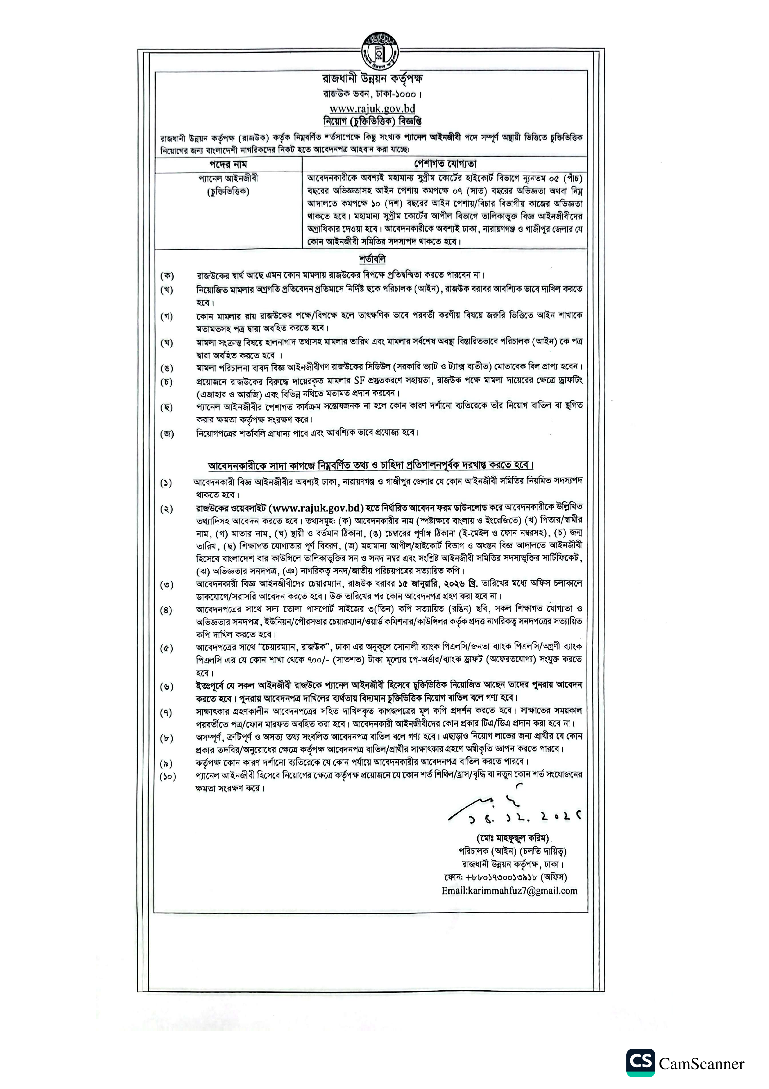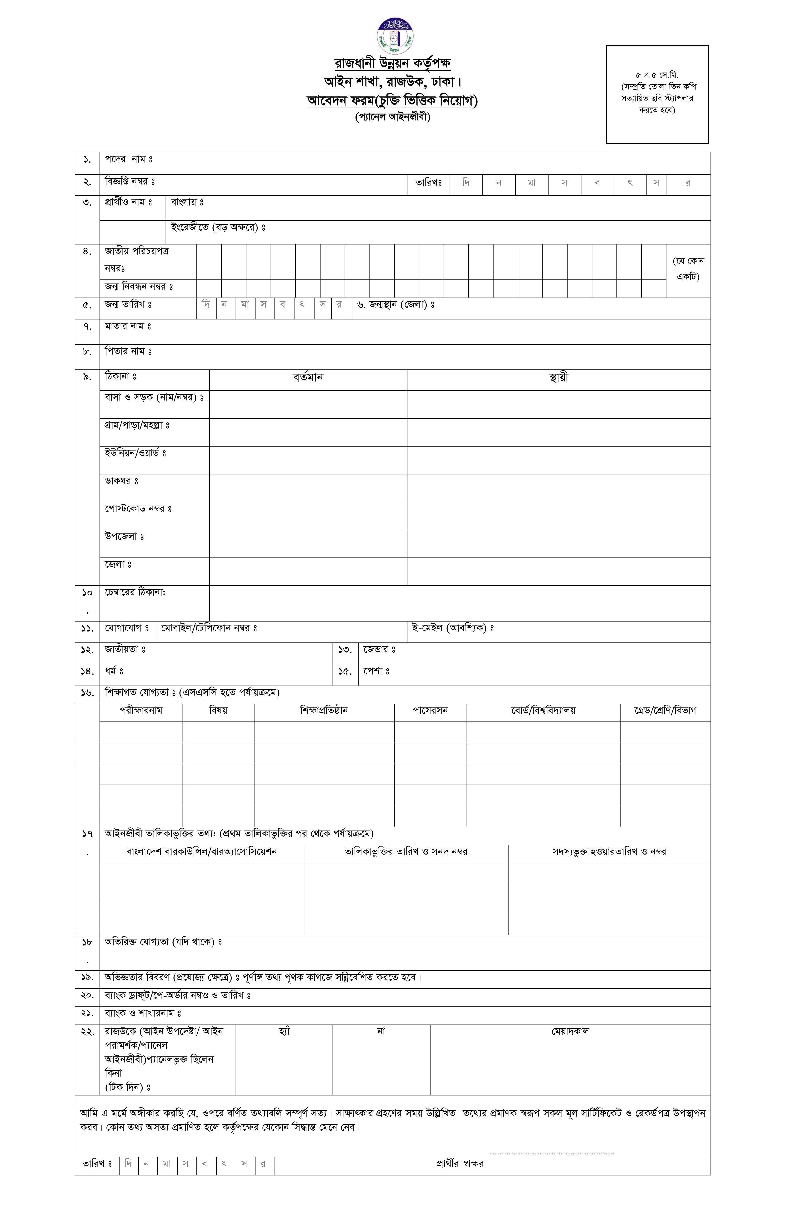 রাজধানী উন্নয়ন কর্তৃপক্ষ (রাজউক) কিছু সংখ্যক প্যানেল আইনজীবী পদে চুক্তিভিত্তিক নিয়োগের জন্য যোগ্যতাসম্পন্ন বাংলাদেশী নাগরিকদের নিকট থেকে আবেদন আহ্বান করেছে।