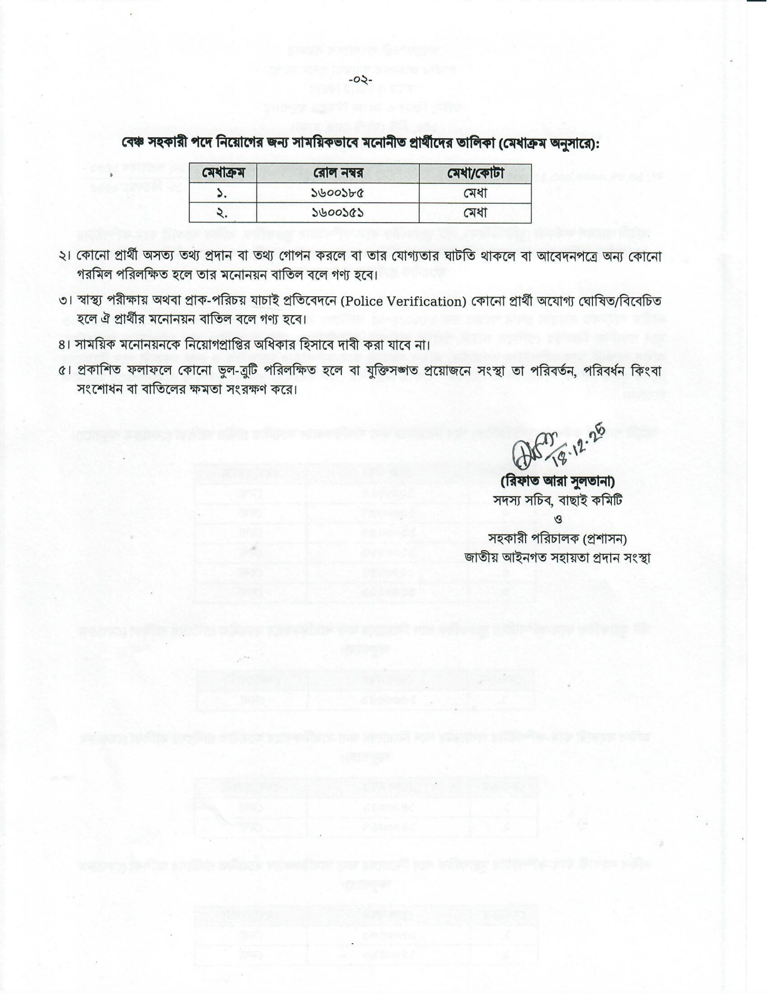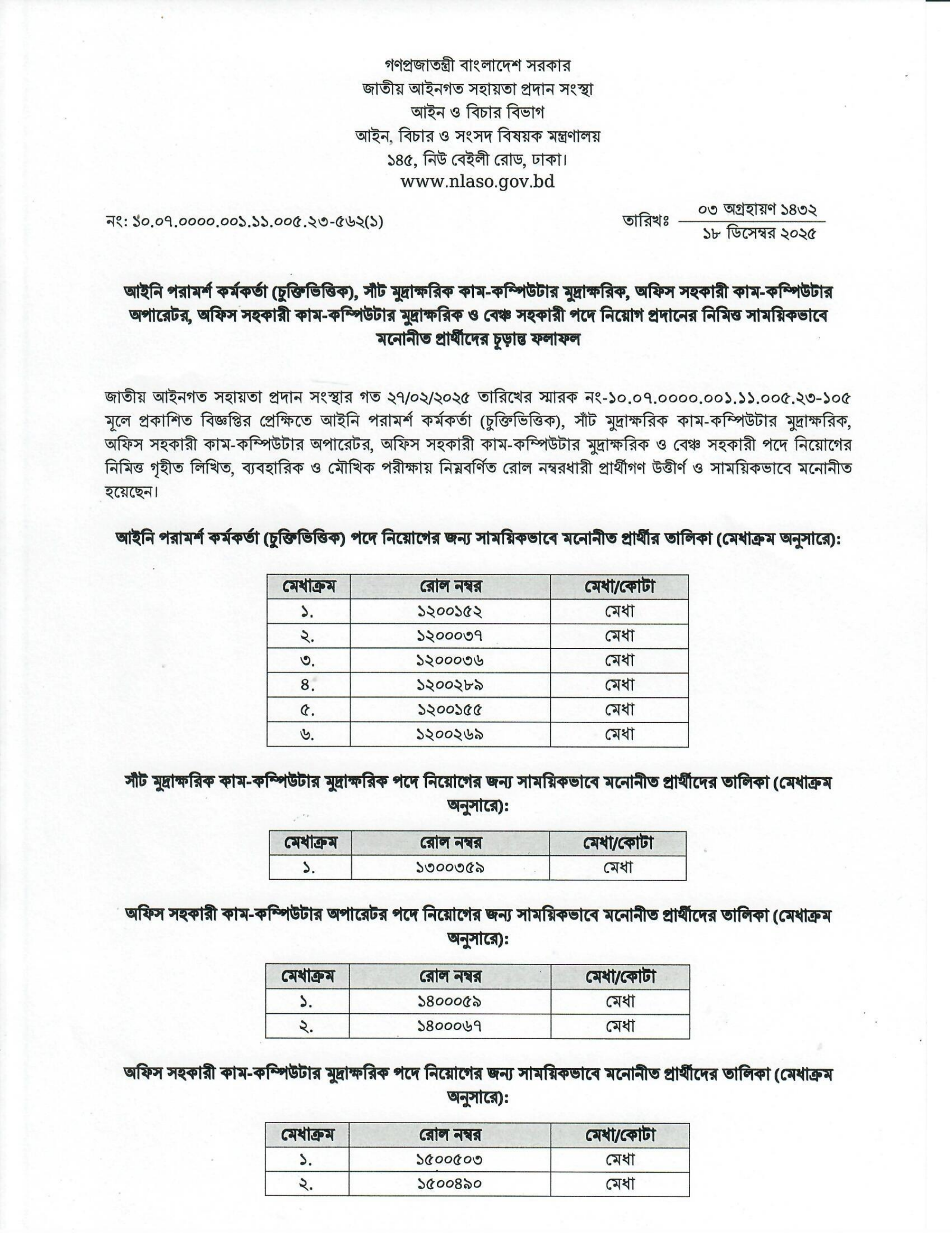 জাতীয় আইনগত সহায়তা প্রদান সংস্থা কর্তৃক বিভিন্ন পদে নিয়োগের নিমিত্ত গৃহীত লিখিত, ব্যবহারিক ও মৌখিক পরীক্ষার চুড়ান্ত ফলাফল প্রকাশিত হয়েছে।