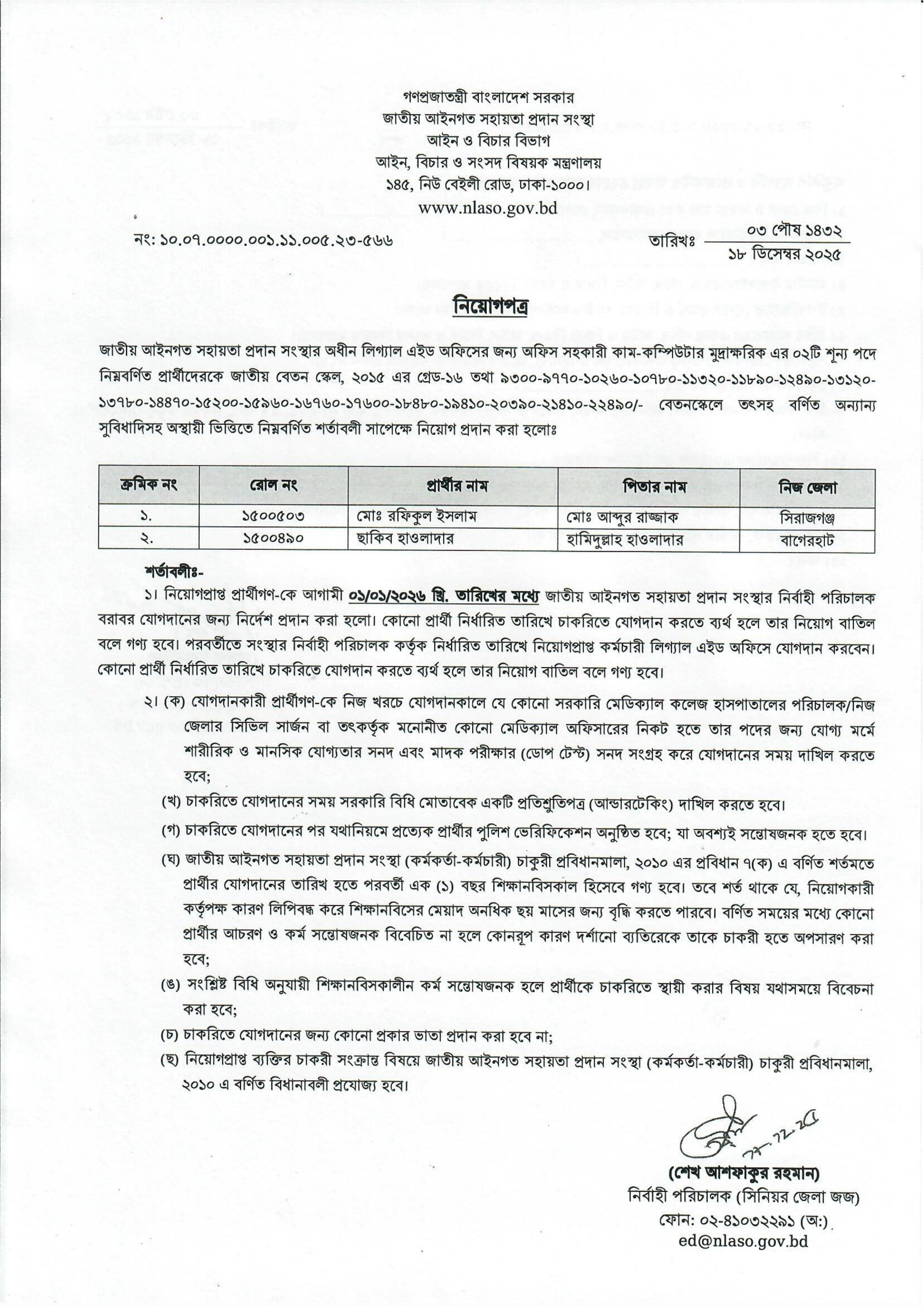 জাতীয় আইনগত সহায়তা প্রদান সংস্থা অফিস সহকারী কাম-কম্পিউটার মুদ্রাক্ষরিক পদের জন্য নিয়োগপত্র প্রকাশ করেছে। এই নিয়োগের মাধ্যমে ০২ (দুই) জন প্রার্থীকে অস্থায়ী ভিত্তিতে নিয়োগ প্রদান করা হয়েছে।
