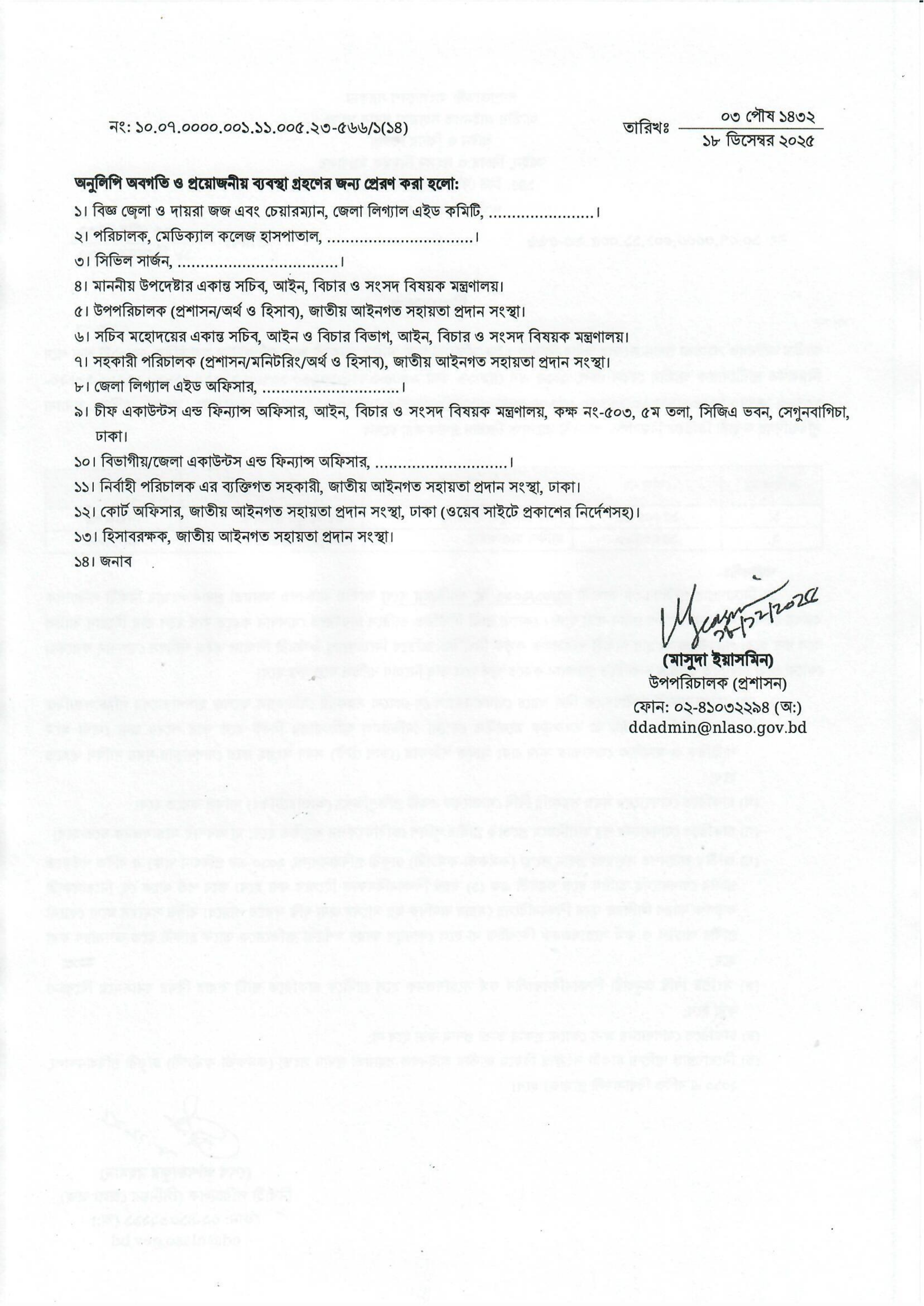 নিয়োগপ্রাপ্ত প্রার্থীগণকে আগামী ০১/০১/২০২৬ তারিখের মধ্যে জাতীয় আইনগত সহায়তা প্রদান সংস্থার নির্বাহী পরিচালক বরাবর যোগদানের জন্য নির্দেশ প্রদান করা হয়েছে। নির্ধারিত তারিখে যোগদান করতে ব্যর্থ হলে নিয়োগ বাতিল বলে গণ্য হবে।
