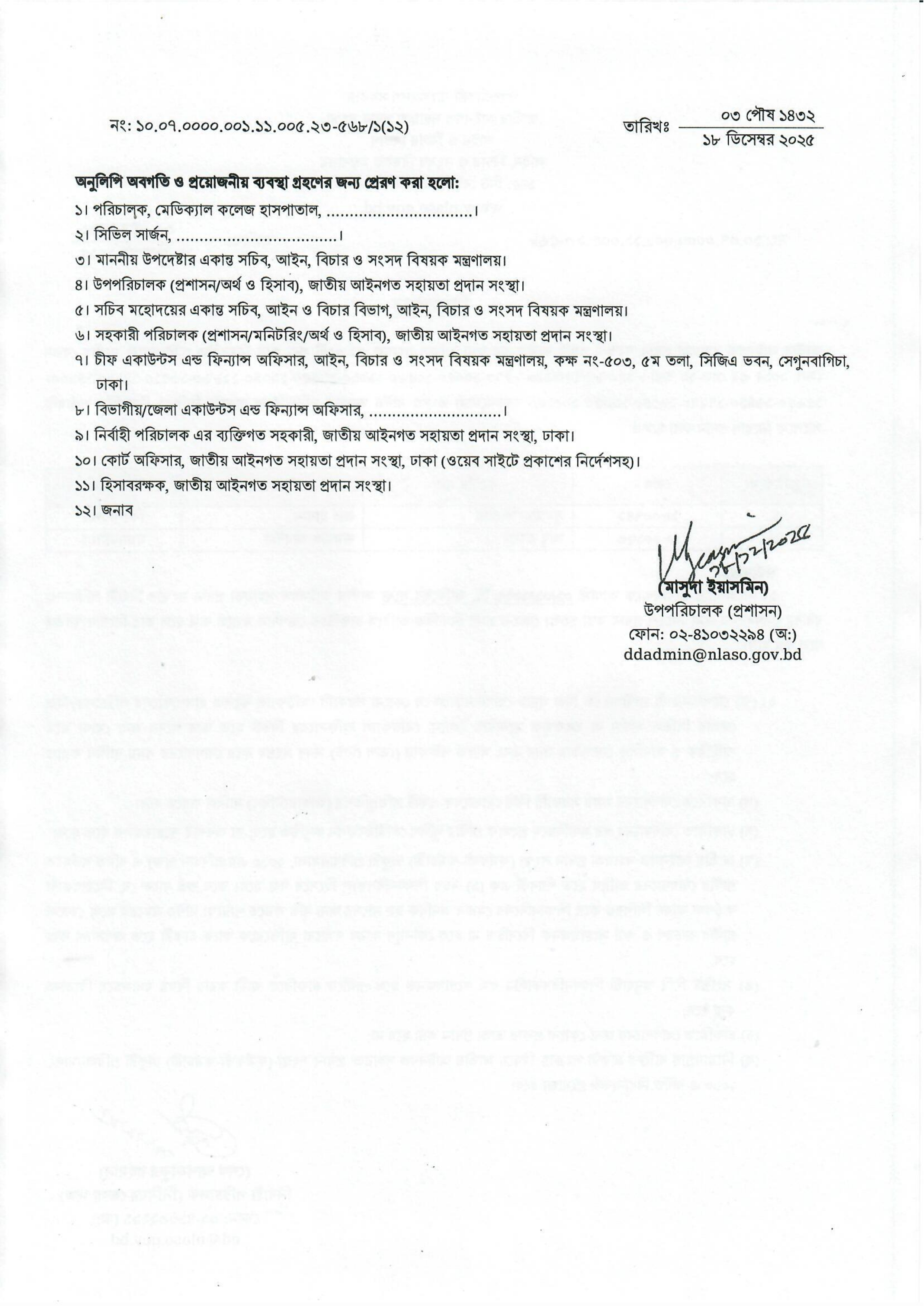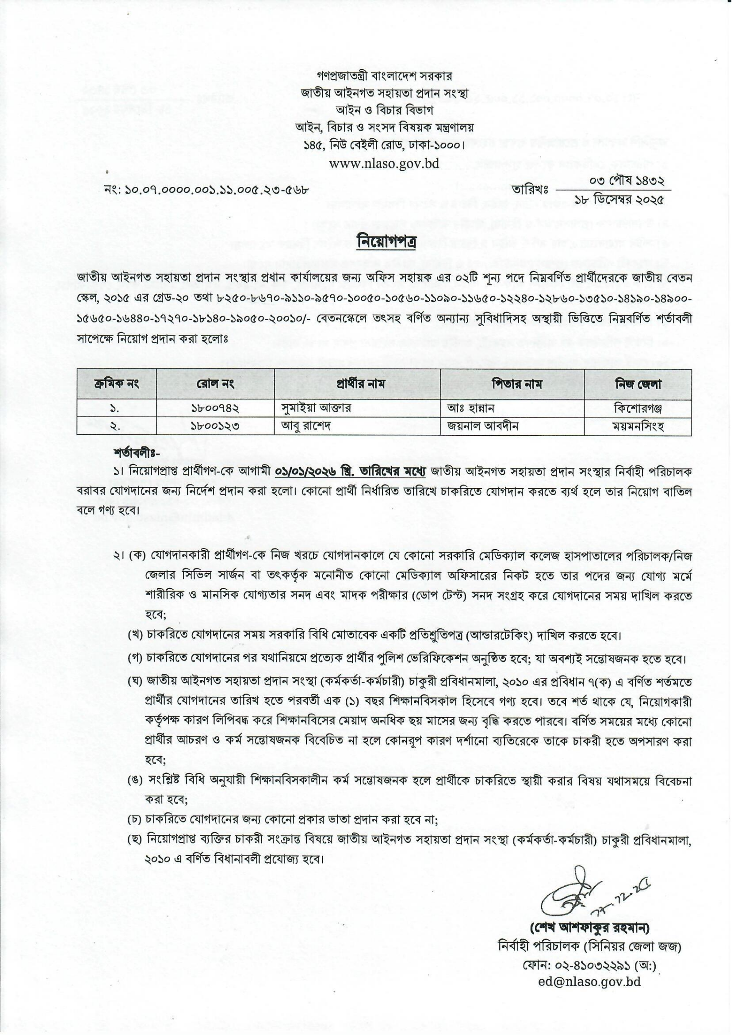 - নিয়োগপ্রাপ্ত প্রার্থীগণকে আগামী ০১/০১/২০২৬ খ্রি. তারিখের মধ্যে জাতীয় আইনগত সহায়তা প্রদান সংস্থার নির্বাহী পরিচালক বরাবর যোগদান করার নির্দেশ দেওয়া হয়েছে।