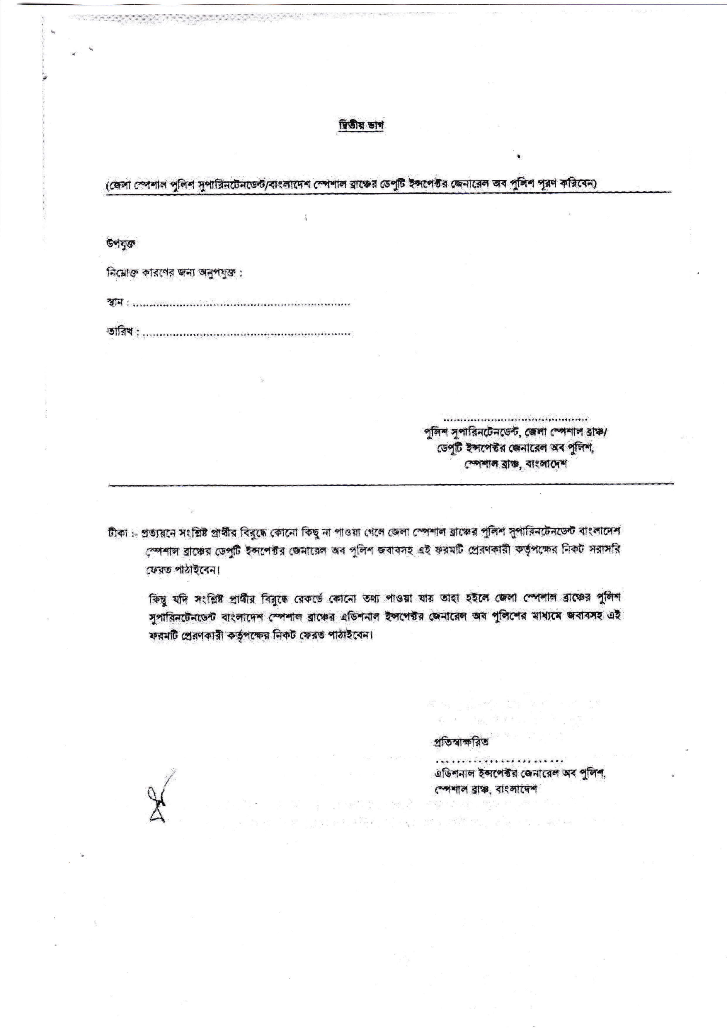 প্রার্থীর দেওয়া সকল তথ্য জেলা স্পেশাল পুলিশ সুপারিনটেনডেন্ট অথবা স্পেশাল ব্রাঞ্চের (SB) মাধ্যমে যাচাই করা হবে। কোনো প্রার্থী মিথ্যা তথ্য প্রদান করলে তার প্রার্থিতা বা পরীক্ষা বাতিলসহ আইনগত ব্যবস্থা গ্রহণ করা হতে পারে।