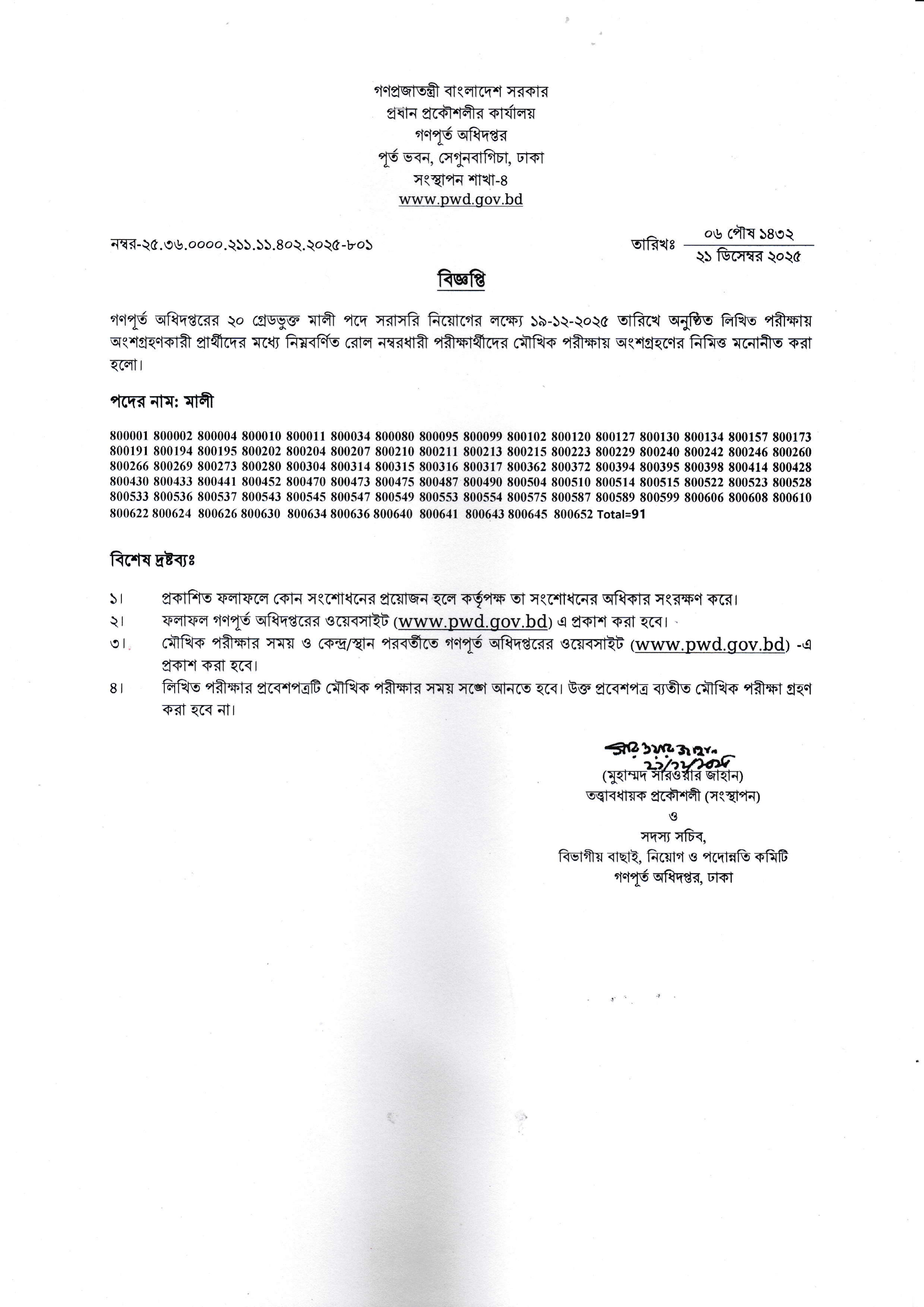 পদের নাম ও উত্তীর্ণের সংখ্যা: মালী পদে মোট ৯১ জন প্রার্থীকে মৌখিক পরীক্ষার জন্য সাময়িকভাবে নির্বাচন করা হয়েছে।