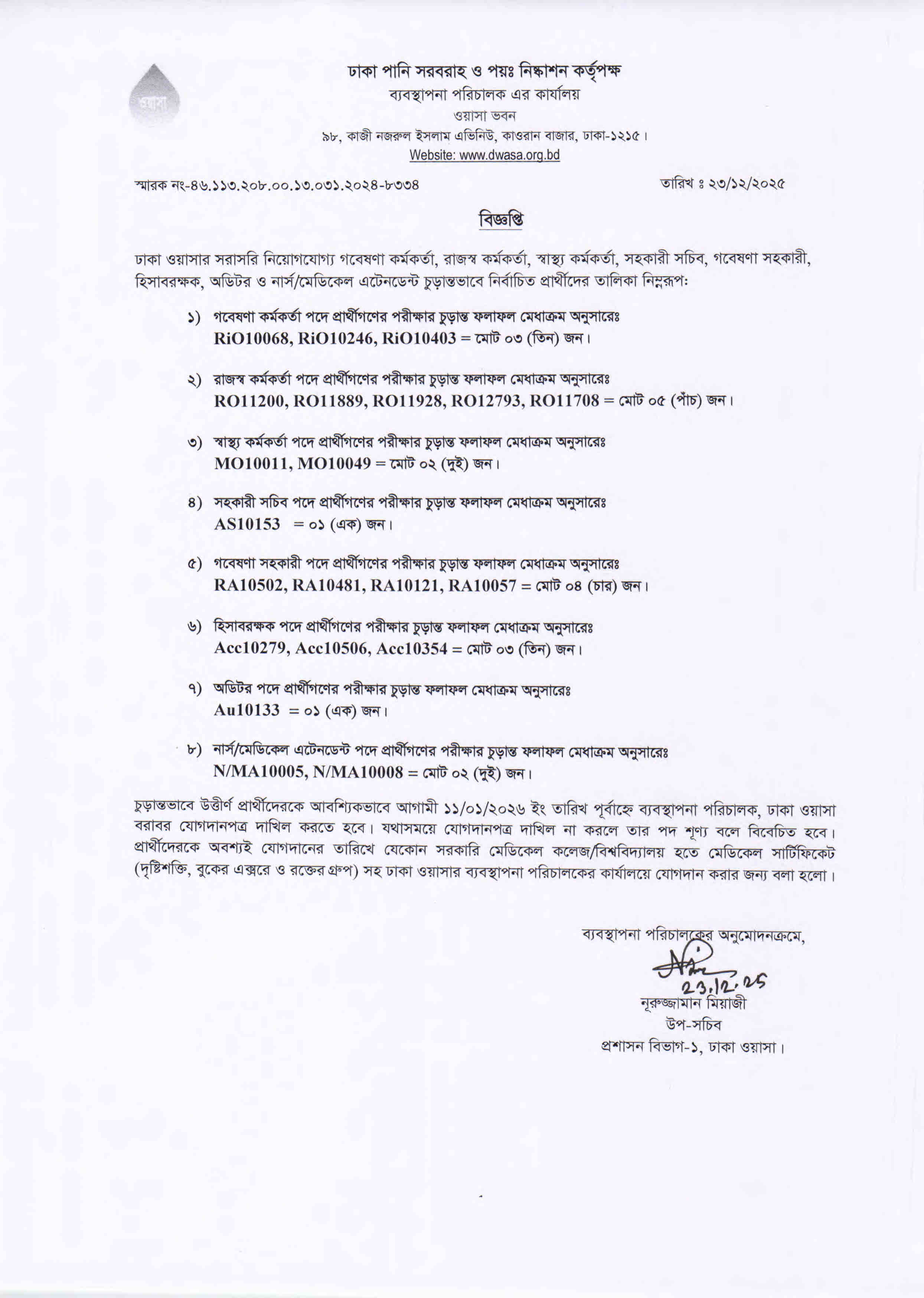চূড়ান্তভাবে নির্বাচিত প্রার্থীদের আগামী ১১/০১/২০২৬ তারিখের মধ্যে ব্যবস্থাপনা পরিচালক, ঢাকা ওয়াসা বরাবর যোগদানপত্র দাখিল করতে হবে। নির্ধারিত সময়ের মধ্যে যোগদানপত্র দাখিল না করলে উক্ত পদটি শূন্য বলে বিবেচিত হবে।