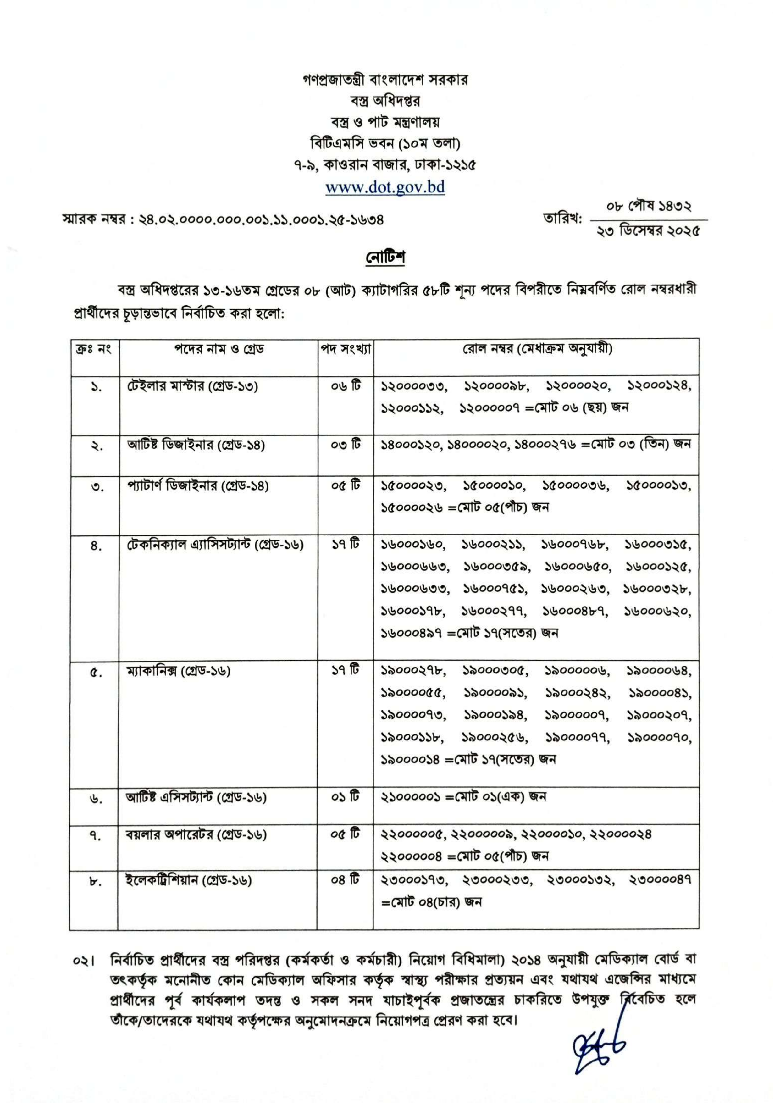বস্ত্র অধিদপ্তরের অধীনে ১৩-১৬তম গ্রেডের ০৮টি ক্যাটাগরির ৫৮টি শূন্য পদের বিপরীতে পরিচালিত নিয়োগ পরীক্ষার চূড়ান্ত ফলাফল প্রকাশ করা হয়েছে। লিখিত ও ব্যবহারিক পরীক্ষায় উত্তীর্ণ প্রার্থীদের মধ্য থেকে মোট ৫৮ জনকে চূড়ান্তভাবে নির্বাচন করা হয়েছে।