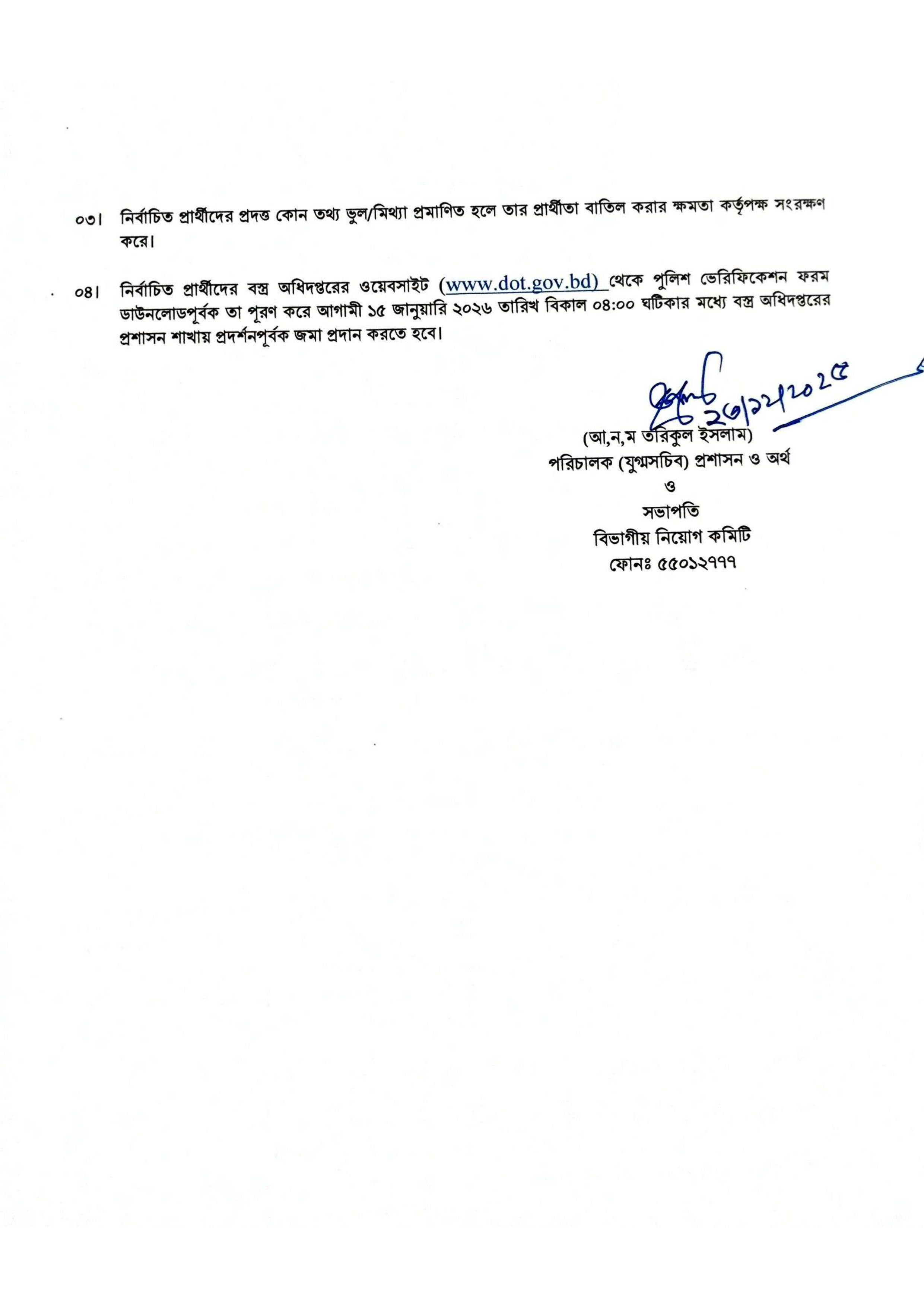 নির্বাচিত প্রার্থীদের বস্ত্র অধিদপ্তরের ওয়েবসাইট (www.dot.gov.bd) থেকে পুলিশ ভেরিফিকেশন ফরম ডাউনলোড করতে হবে। যথাযথভাবে পূরণকৃত ফরম আগামী ১৫ জানুয়ারি ২০২৬ তারিখ বিকাল ০৪:০০ ঘটিকার মধ্যে বস্ত্র অধিদপ্তরের প্রশাসন শাখায় সরাসরি জমা দিতে হবে। স্বাস্থ্য পরীক্ষা এবং ভেরিফিকেশন সন্তোষজনক হলে যথাযথ কর্তৃপক্ষের অনুমোদনক্রমে নিয়োগপত্র প্রদান করা হবে।
