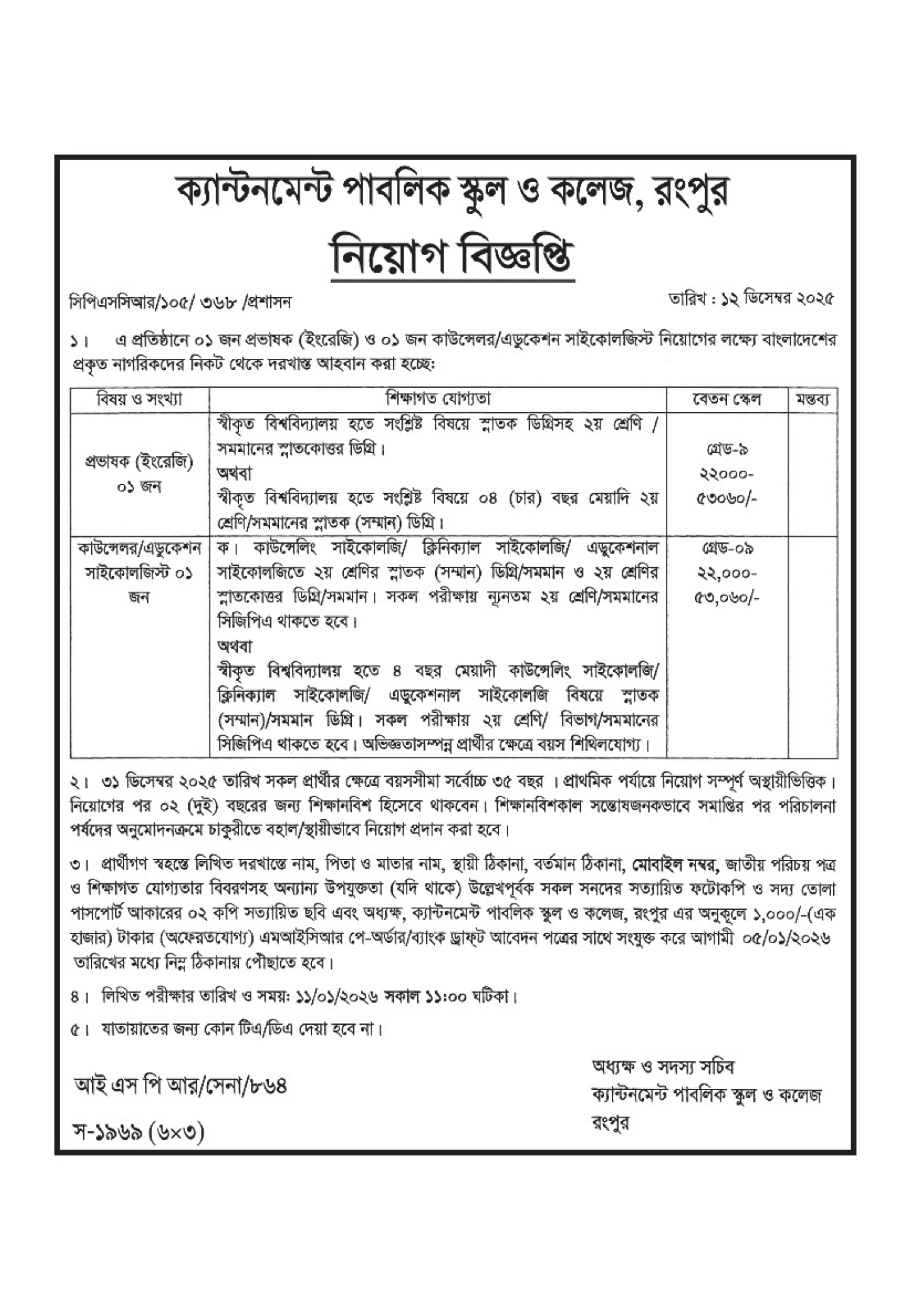 পরীক্ষার তারিখ, সময় ও স্থান: ১১ জানুয়ারি ২০২৬ তারিখ সকাল ১১:০০ ঘটিকায় ক্যান্টনমেন্ট পাবলিক স্কুল ও কলেজ, রংপুর প্রাঙ্গণে লিখিত পরীক্ষা অনুষ্ঠিত হবে।