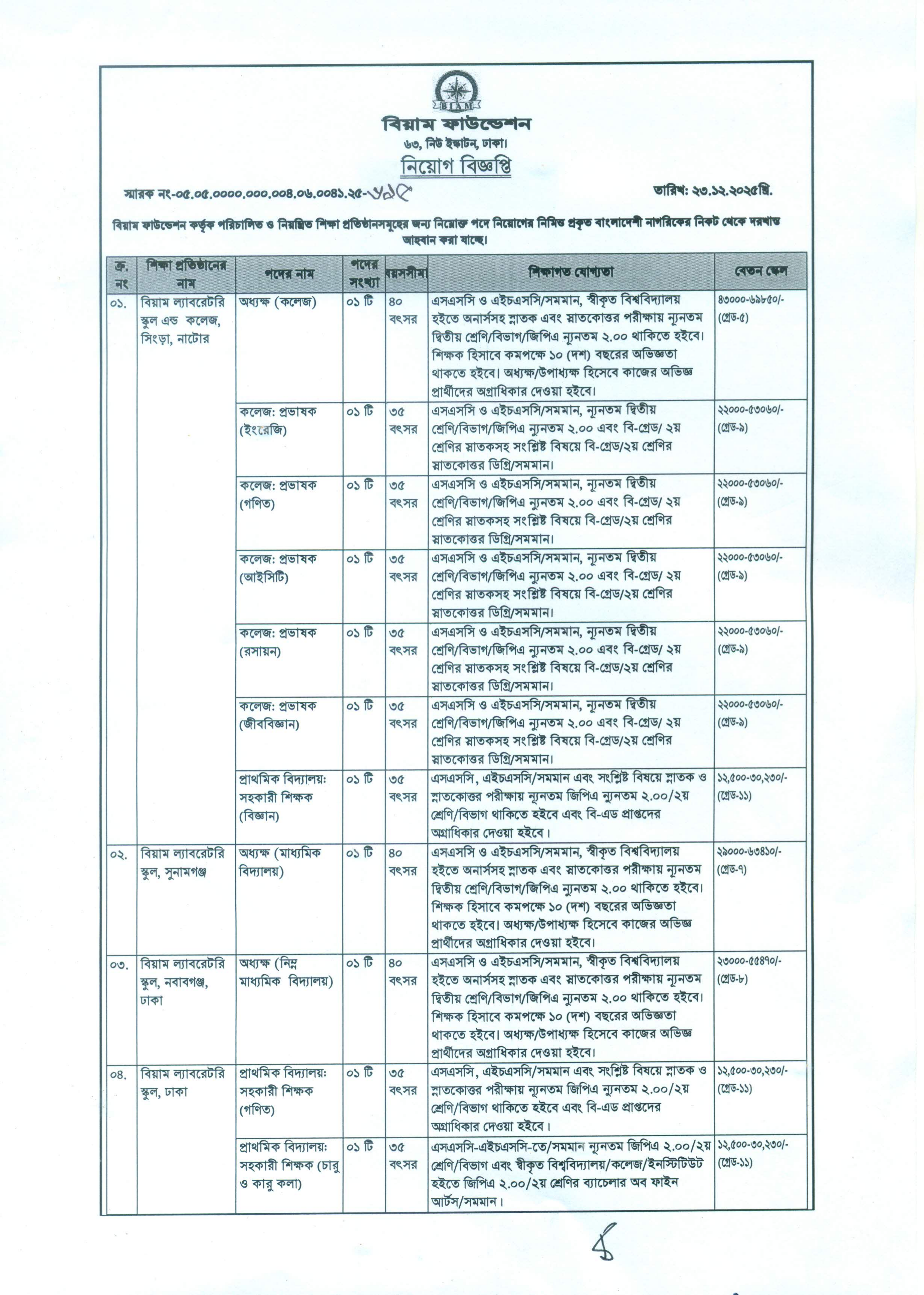 বিয়াম ফাউন্ডেশন কর্তৃক পরিচালিত ও নিয়ন্ত্রিত দেশের বিভিন্ন শিক্ষা প্রতিষ্ঠানসমূহের (স্কুল ও কলেজ) শূন্য পদসমূহে জনবল নিয়োগের লক্ষ্যে নতুন নিয়োগ বিজ্ঞপ্তি প্রকাশিত হয়েছে। আগ্রহী যোগ্য বাংলাদেশী নাগরিকরা অনলাইনে আবেদন করতে পারবেন।