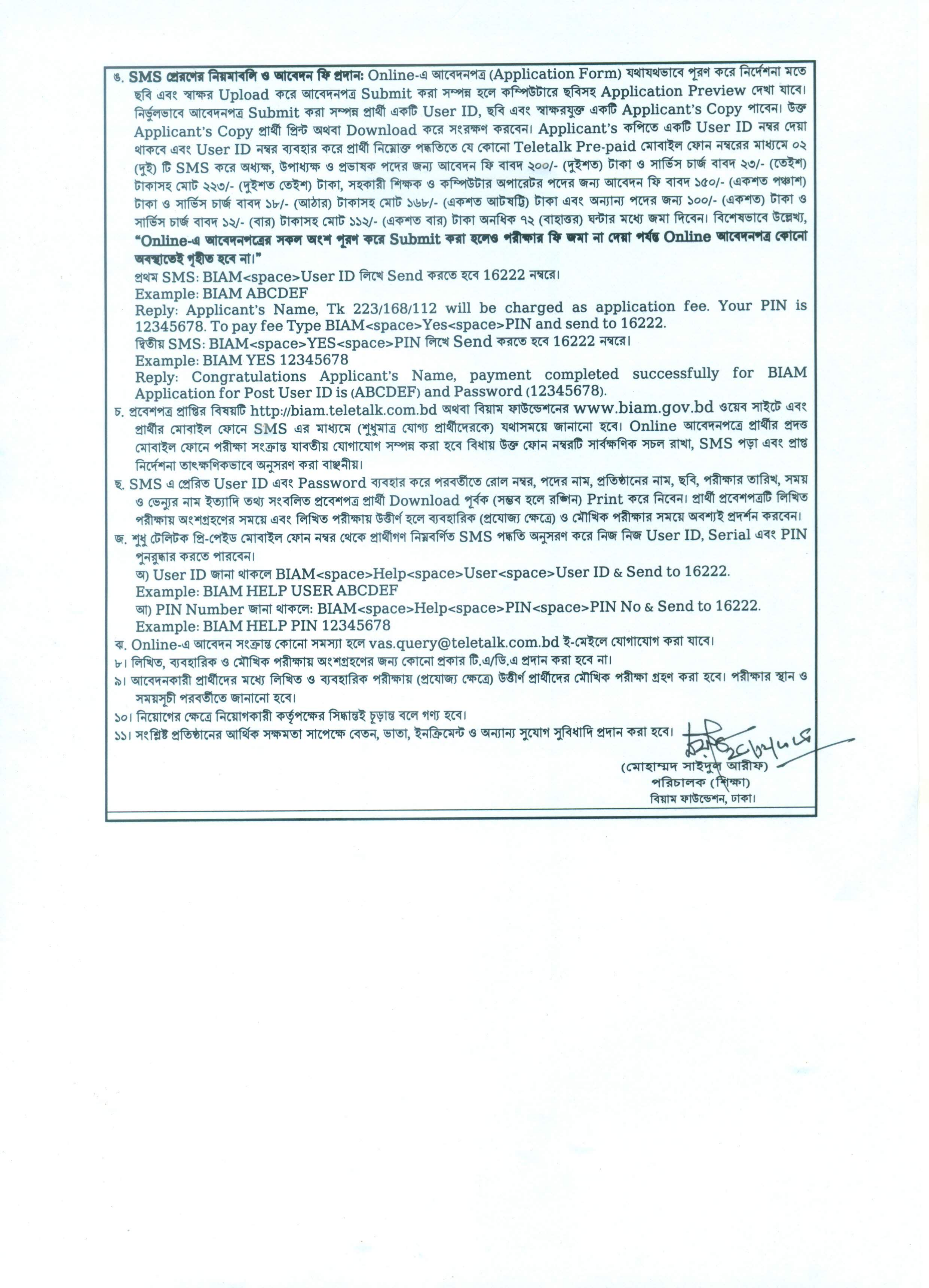 আগ্রহী প্রার্থীদের অনলাইনে http://biam.teletalk.com.bd ওয়েবসাইটের মাধ্যমে আবেদন ফরম পূরণ করতে হবে। আবেদন সাবমিট করার পর পরবর্তী ৭২ ঘণ্টার মধ্যে টেলিটক প্রিপেইড মোবাইল নম্বর থেকে এসএমএস-এর মাধ্যমে আবেদন ফি জমা দিতে হবে।