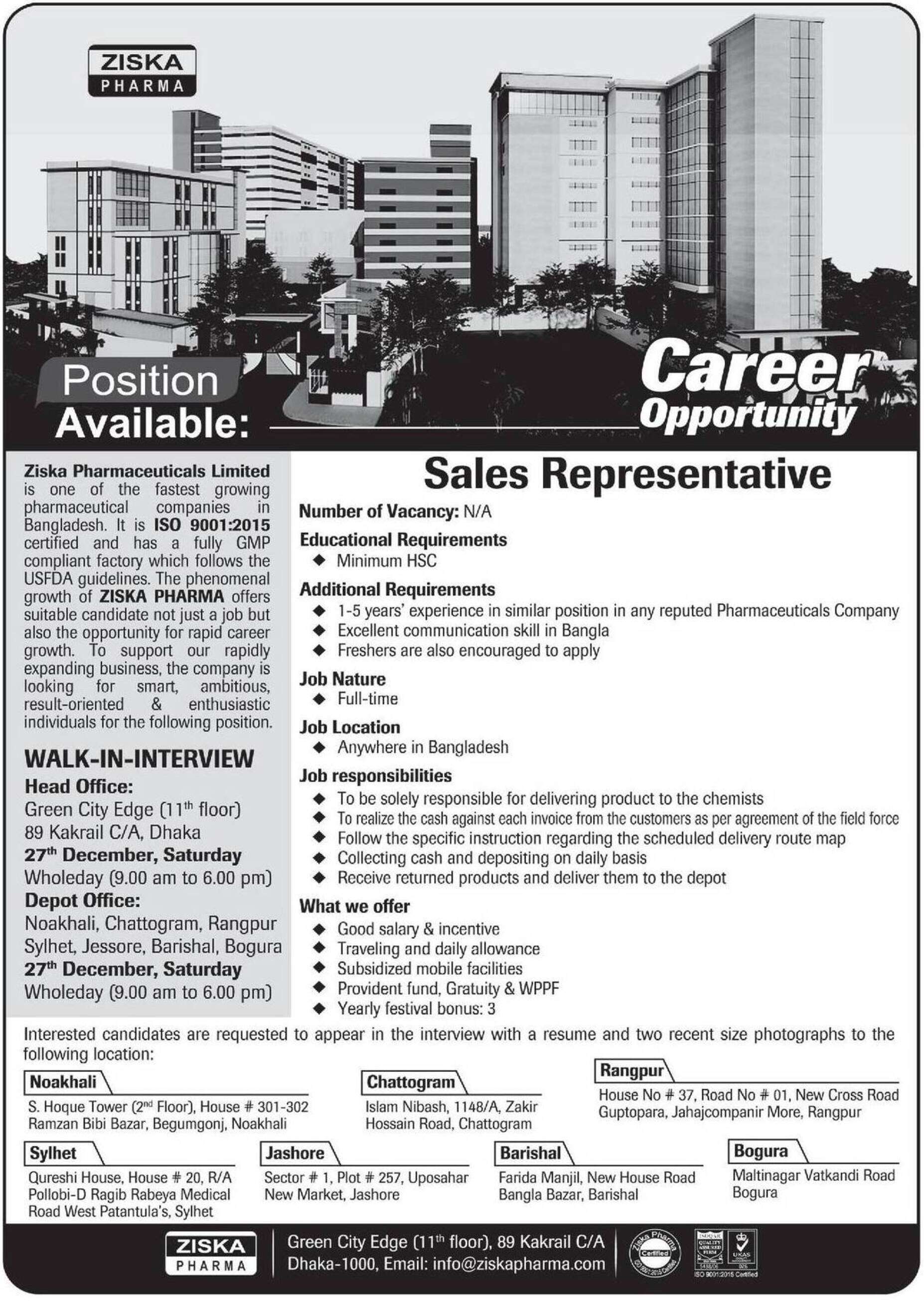 বাংলাদেশের অন্যতম দ্রুত বর্ধনশীল এবং ISO 9001:2015 সার্টিফাইড ফার্মাসিউটিক্যাল কোম্পানি 'জিসকা ফার্মাসিউটিক্যালস লিমিটেড' তাদের ব্যবসা সম্প্রসারণের লক্ষ্যে কিছু সংখ্যক উদ্যমী ও পরিশ্রমী কর্মী খুঁজছে।