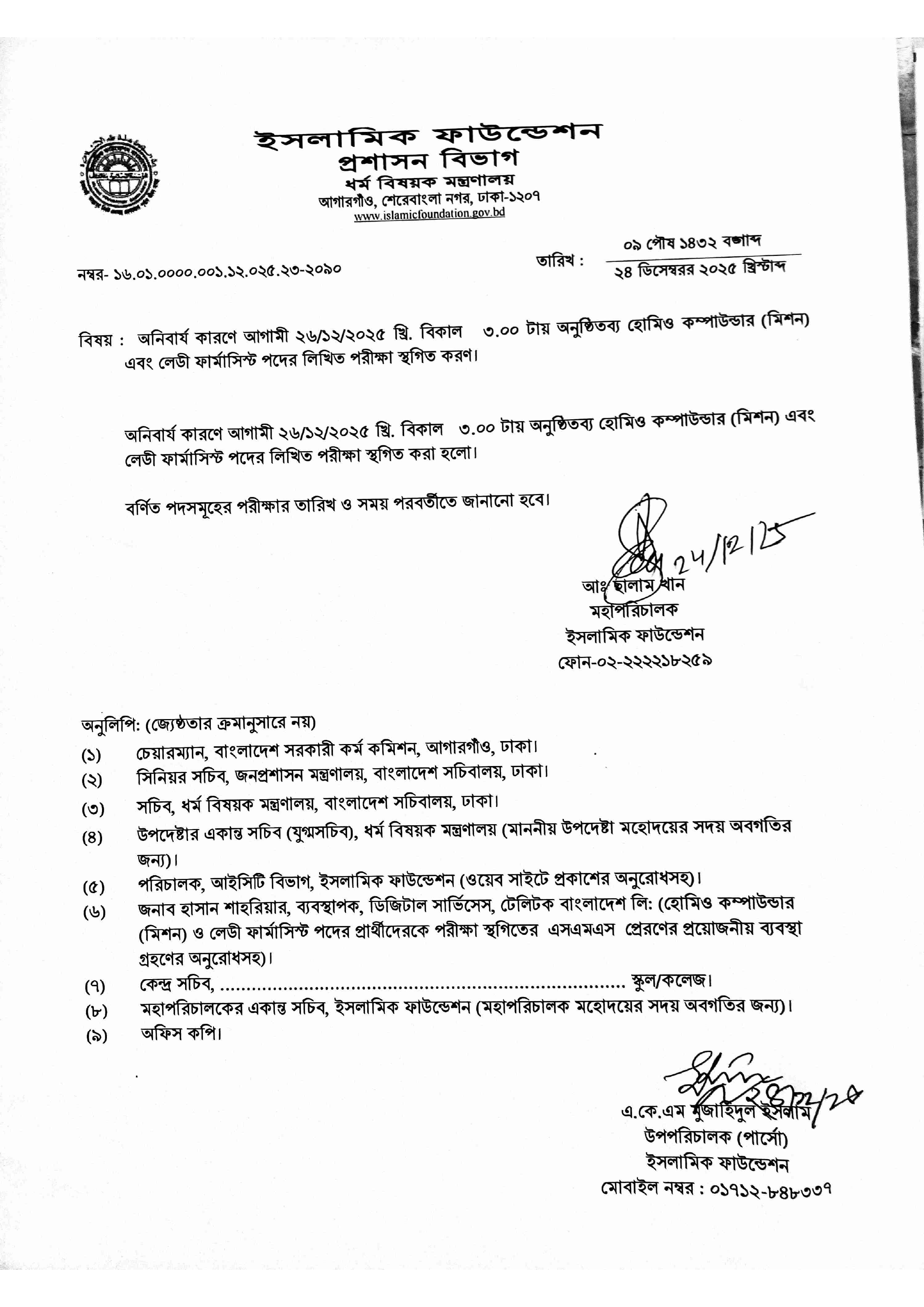 ধর্ম বিষয়ক মন্ত্রণালয়ের অধীনস্থ ইসলামিক ফাউন্ডেশনের নিয়োগ পরীক্ষার সময়সূচি পরিবর্তন করা হয়েছে। অনিবার্য কারণে আগামী ২৬ ডিসেম্বর ২০২৫ তারিখে অনুষ্ঠিতব্য লিখিত পরীক্ষাটি স্থগিত ঘোষণা করা হয়েছে।