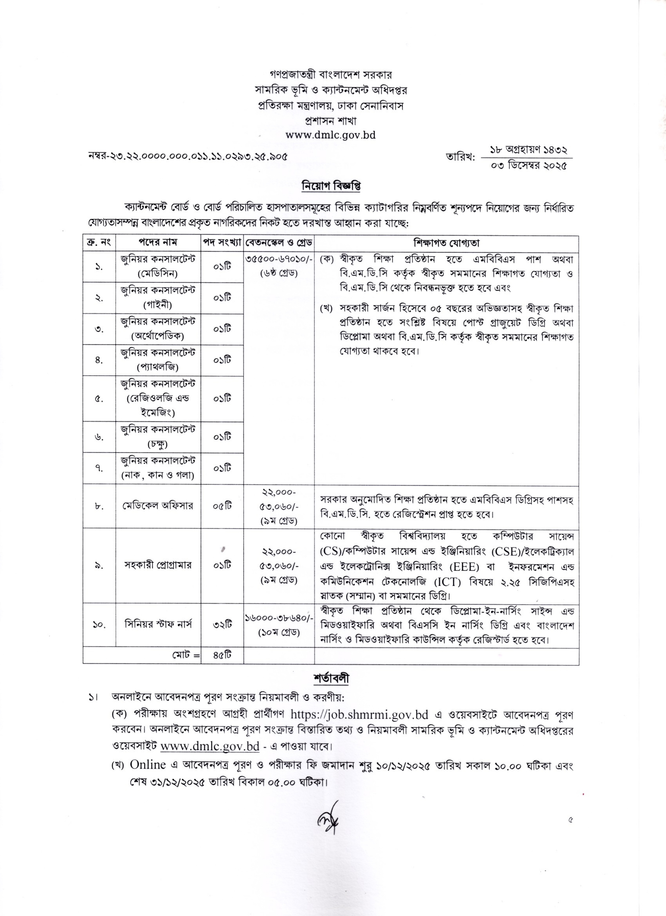 প্রতিরক্ষা মন্ত্রণালয়ের অধীন সামরিক ভূমি ও ক্যান্টনমেন্ট অধিদপ্তরের আওতাধীন বিভিন্ন ক্যান্টনমেন্ট বোর্ড পরিচালিত হাসপাতাল ও প্রতিষ্ঠানসমূহে জনবল নিয়োগের জন্য বিজ্ঞপ্তি প্রকাশ করা হয়েছে। আগ্রহী যোগ্য প্রার্থীরা অনলাইনে আবেদন করতে পারবেন।