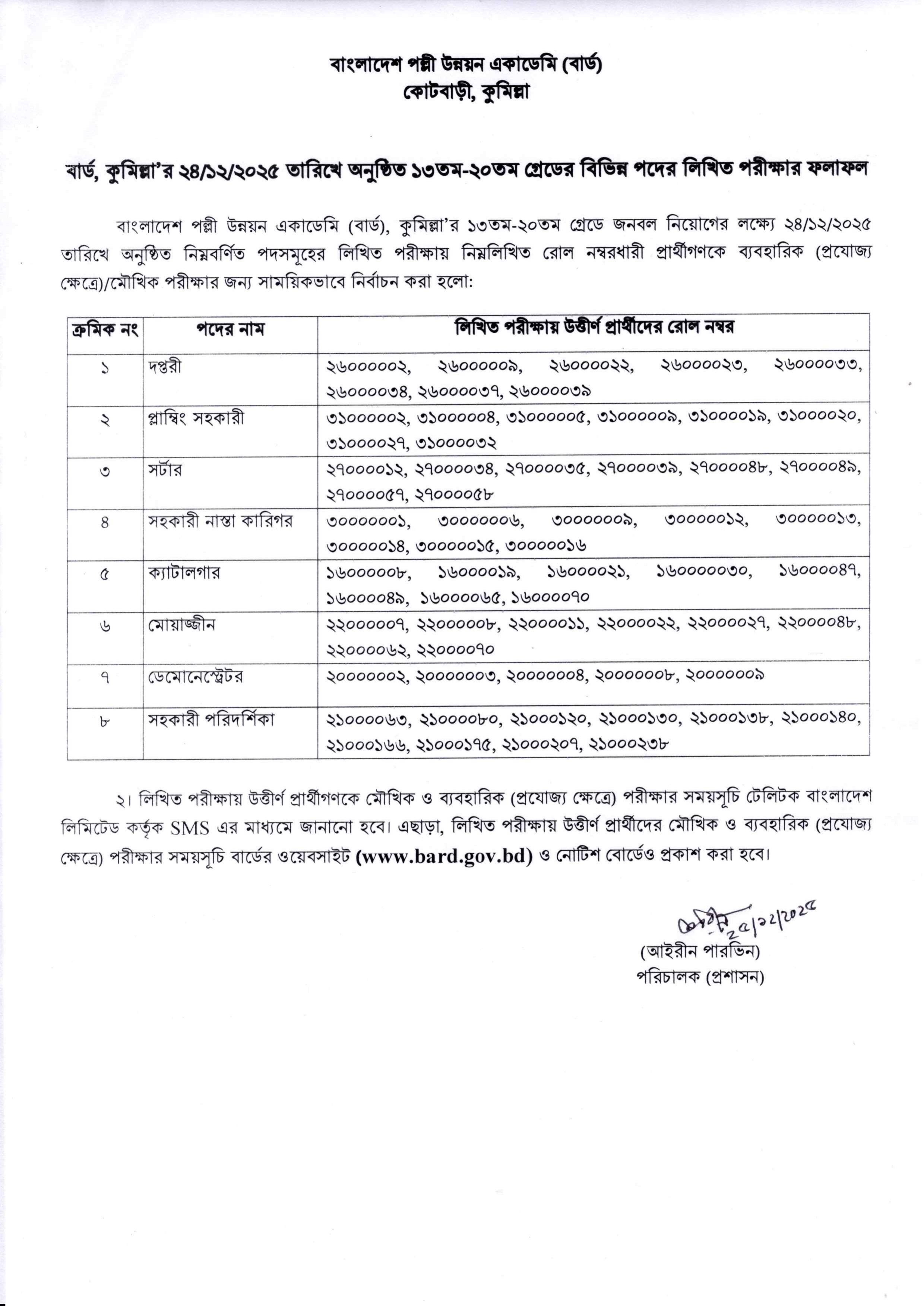 বাংলাদেশ পল্লী উন্নয়ন একাডেমি (বার্ড), কুমিল্লা-এর ১৩তম থেকে ২০তম গ্রেডের বিভিন্ন পদে জনবল নিয়োগের লক্ষ্যে অনুষ্ঠিত লিখিত পরীক্ষার ফলাফল প্রকাশিত হয়েছে।