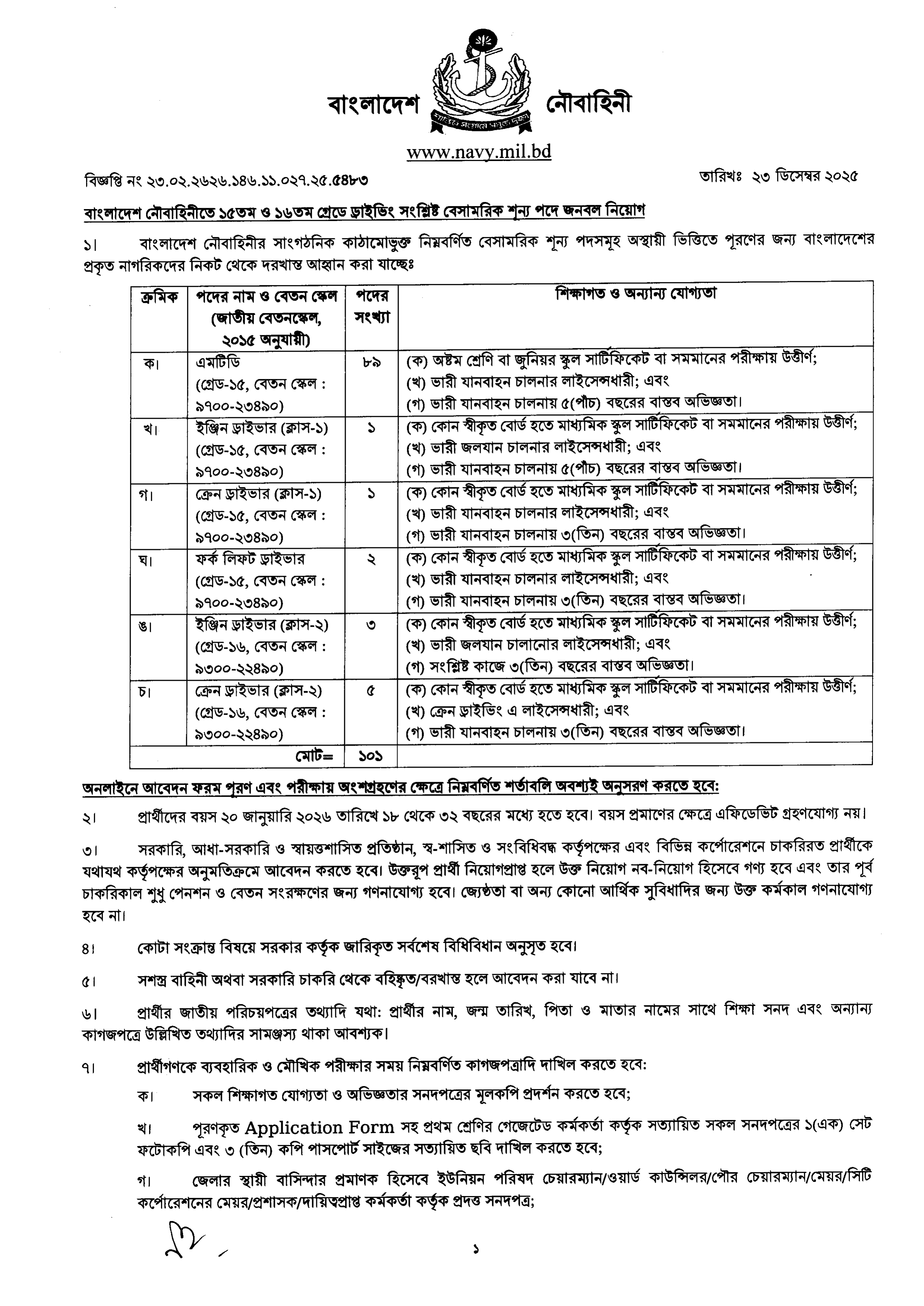 অন্যান্য তথ্য: নিয়োগপ্রাপ্তদের প্রধানত চট্টগ্রাম ও খুলনা নৌ অঞ্চলের বিভিন্ন সংস্থায় পদায়ন করা হবে। ব্যবহারিক ও মৌখিক পরীক্ষার সময় সকল মূল সনদপত্র প্রদর্শন করতে হবে।
