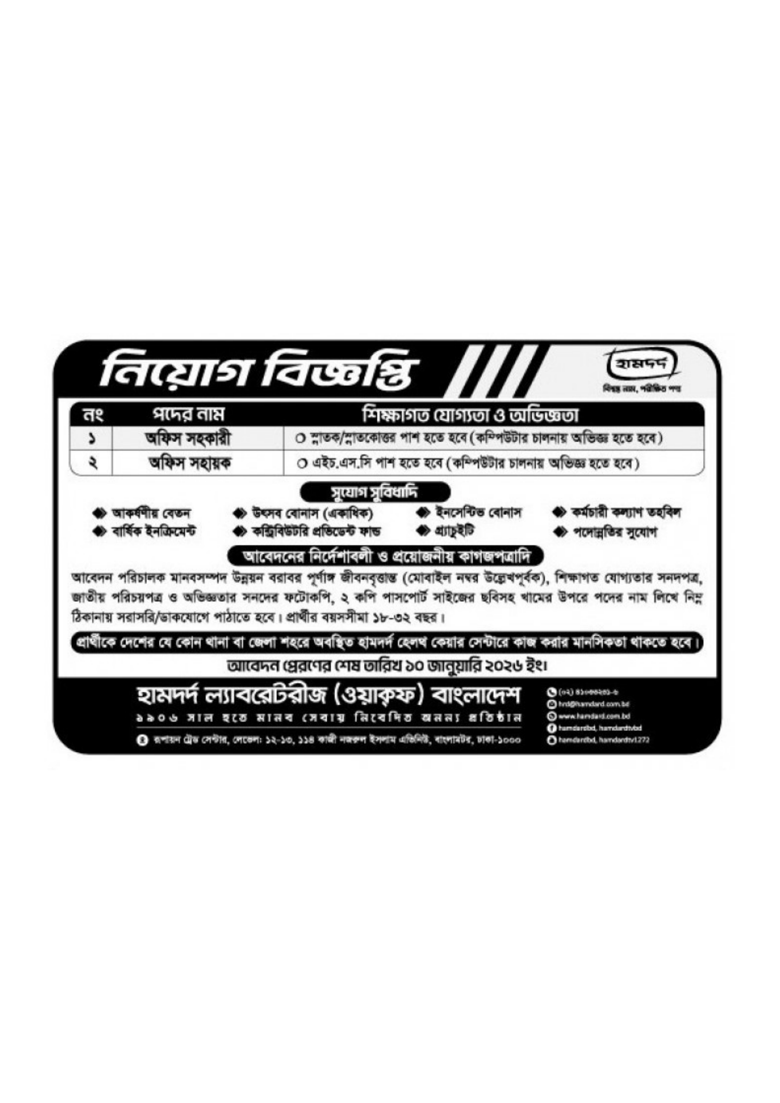 হামদর্দ বাংলাদেশ জনবল নিয়োগের লক্ষ্যে একটি নতুন নিয়োগ বিজ্ঞপ্তি প্রকাশ করেছে। প্রতিষ্ঠানটি তাদের বিভিন্ন হেলথ কেয়ার সেন্টারের জন্য যোগ্য প্রার্থীদের কাছ থেকে দরখাস্ত আহ্বান করছে।