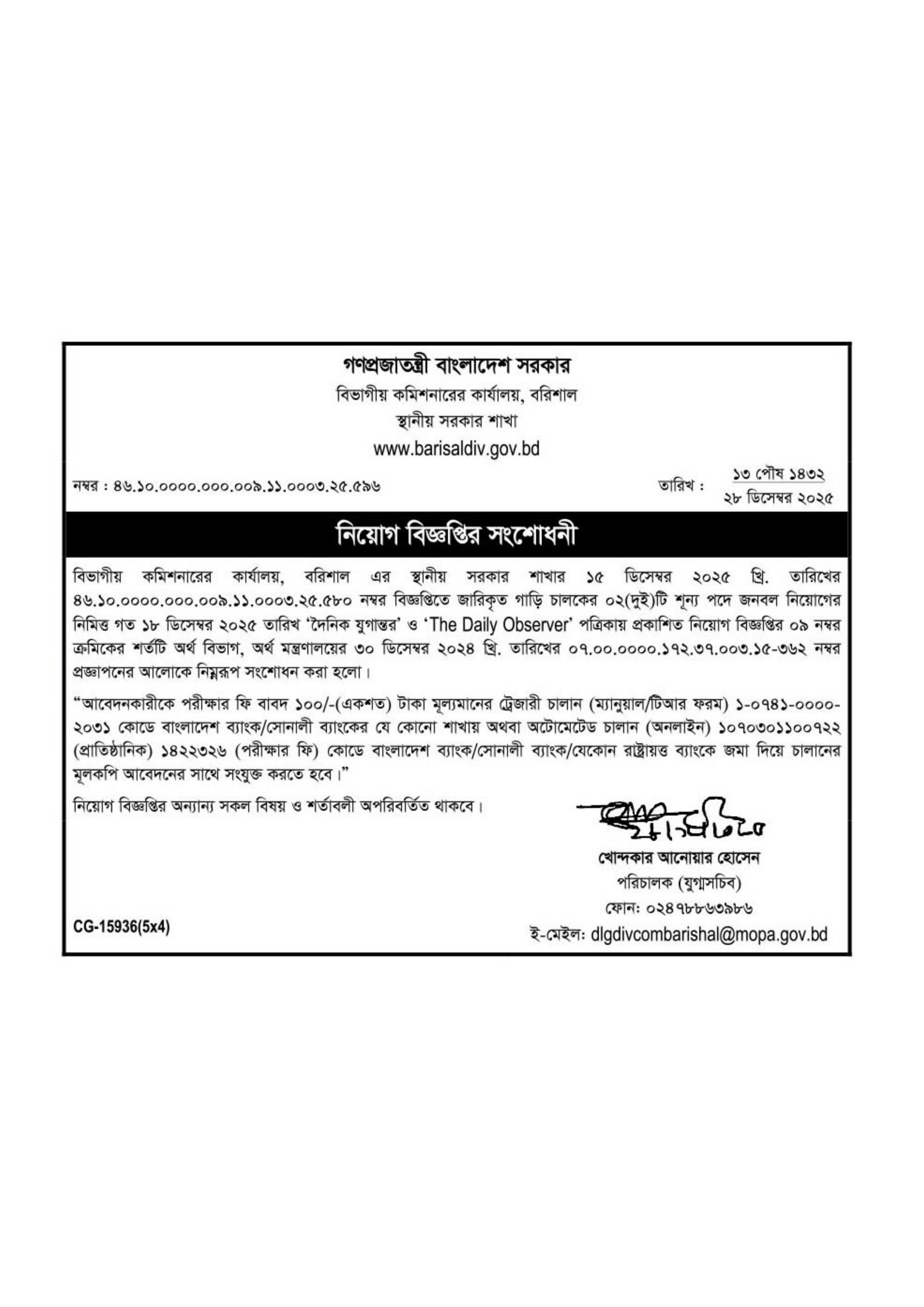 বিভাগীয় কমিশনারের কার্যালয়, বরিশাল এর স্থানীয় সরকার শাখার অধীনে গাড়ি চালক পদে জনবল নিয়োগের জন্য প্রকাশিত বিজ্ঞপ্তির সংশোধনী প্রকাশ করা হয়েছে। পূর্বের বিজ্ঞপ্তির আবেদন ফি সংক্রান্ত শর্তটি সংশোধন করা হয়েছে।