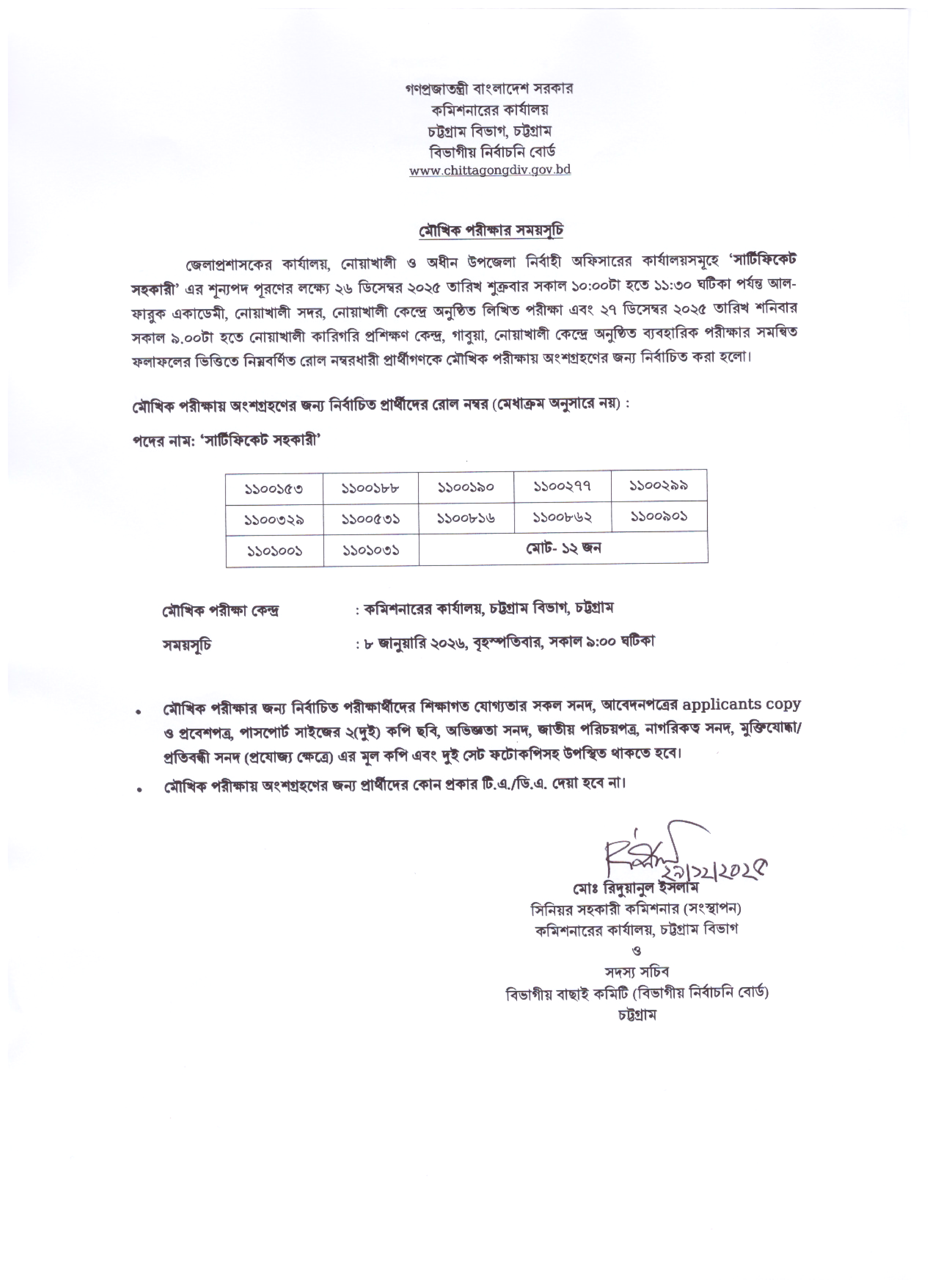 চট্টগ্রাম বিভাগীয় কমিশনারের কার্যালয়ের আওতাধীন জেলা প্রশাসকের কার্যালয়, নোয়াখালী ও অধীন উপজেলা নির্বাহী অফিসারের কার্যালয়সমূহের শূন্যপদ পূরণের লক্ষ্যে অনুষ্ঠিত লিখিত ও ব্যবহারিক পরীক্ষার ফলাফলের ভিত্তিতে মৌখিক পরীক্ষার সময়সূচি প্রকাশ করা হয়েছে। মোট ১২ জন প্রার্থীকে মৌখিক পরীক্ষার জন্য সাময়িকভাবে নির্বাচিত করা হয়েছে।