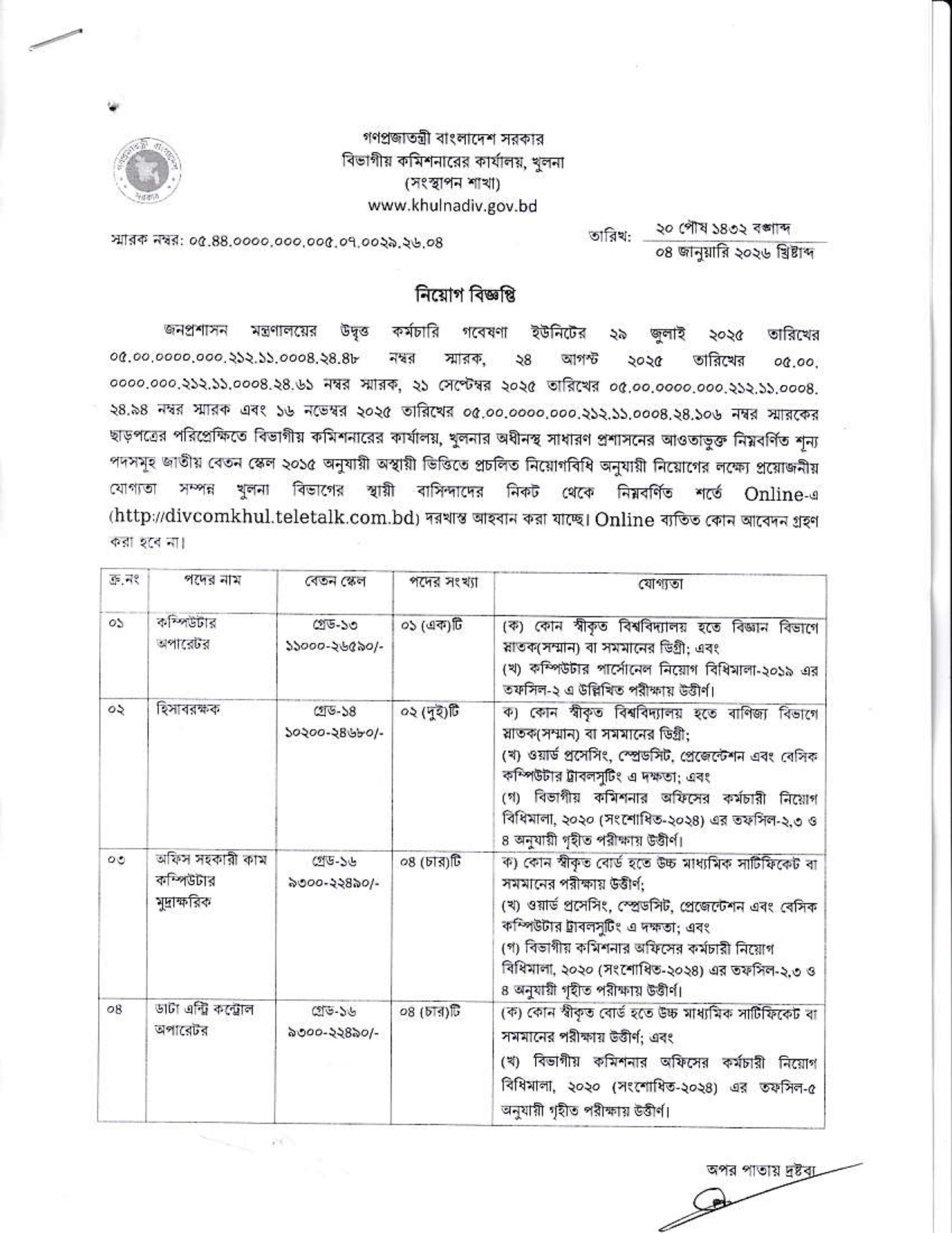বিভাগীয় কমিশনারের কার্যালয়, খুলনা তাদের অধীনস্থ সাধারণ প্রশাসনের আওতায় বেশ কিছু শূন্য পদে জনবল নিয়োগের জন্য বিজ্ঞপ্তি প্রকাশ করেছে। এই নিয়োগের মাধ্যমে খুলনা বিভাগের স্থায়ী বাসিন্দাদের সরকারি চাকরিতে যোগদানের সুযোগ দেওয়া হচ্ছে।