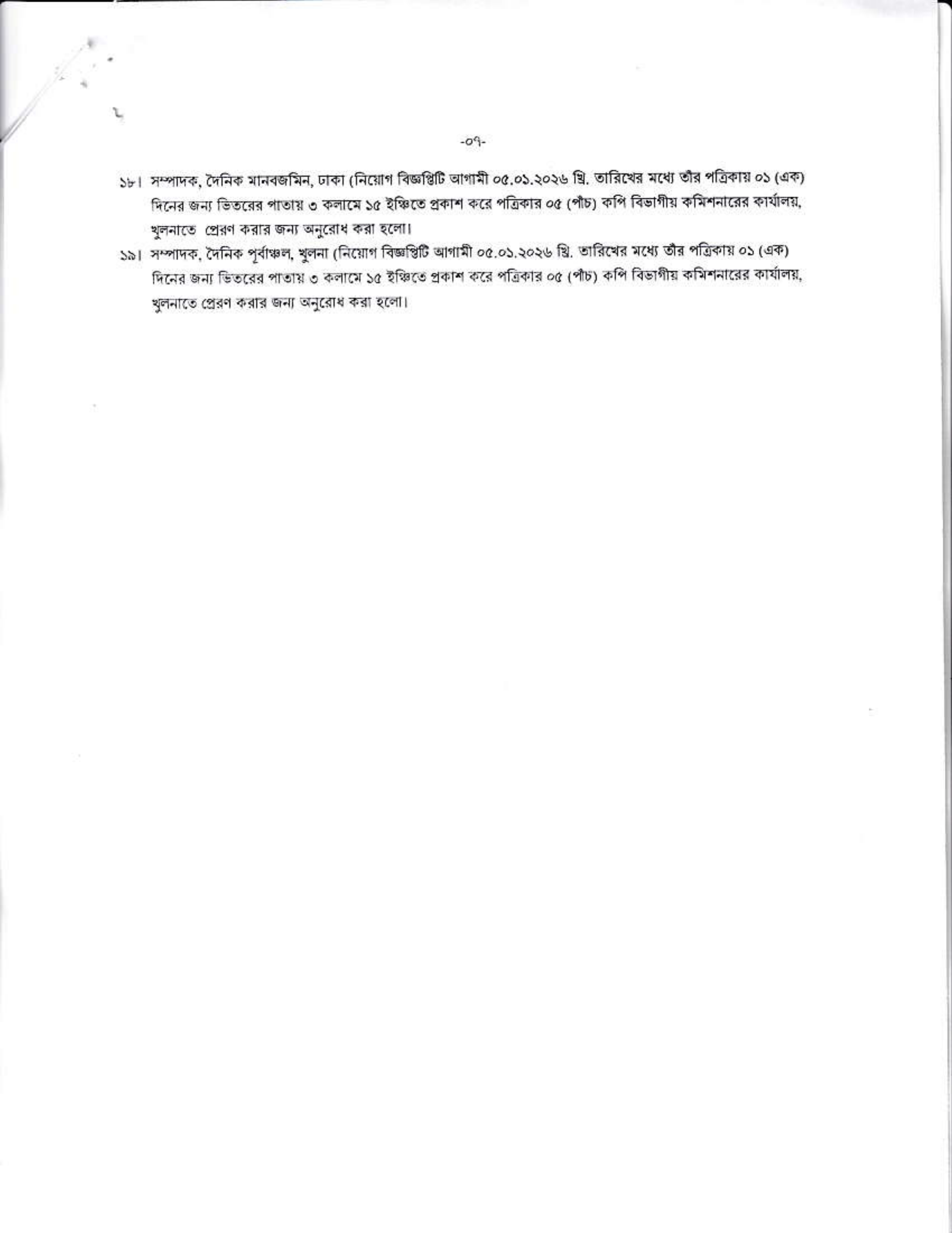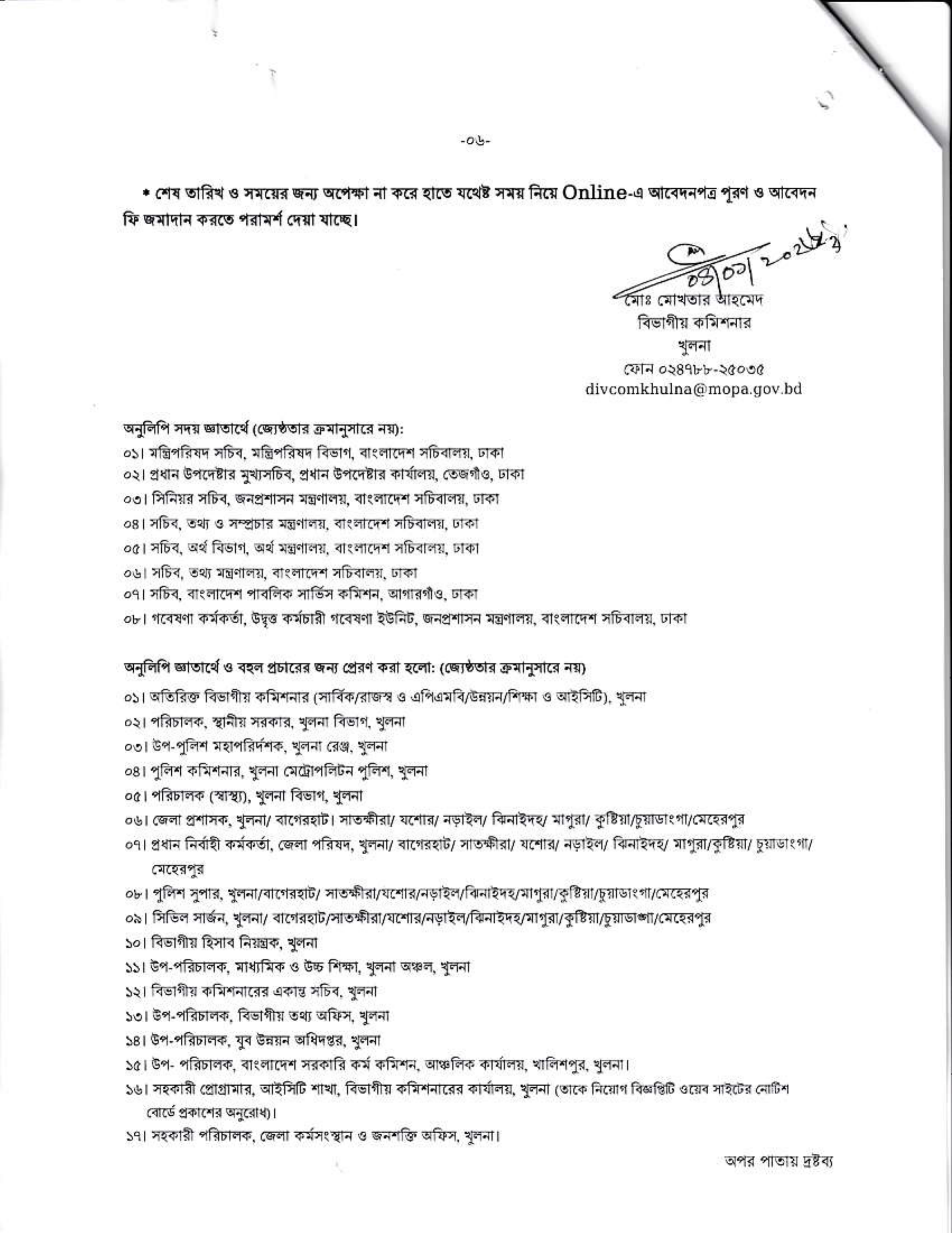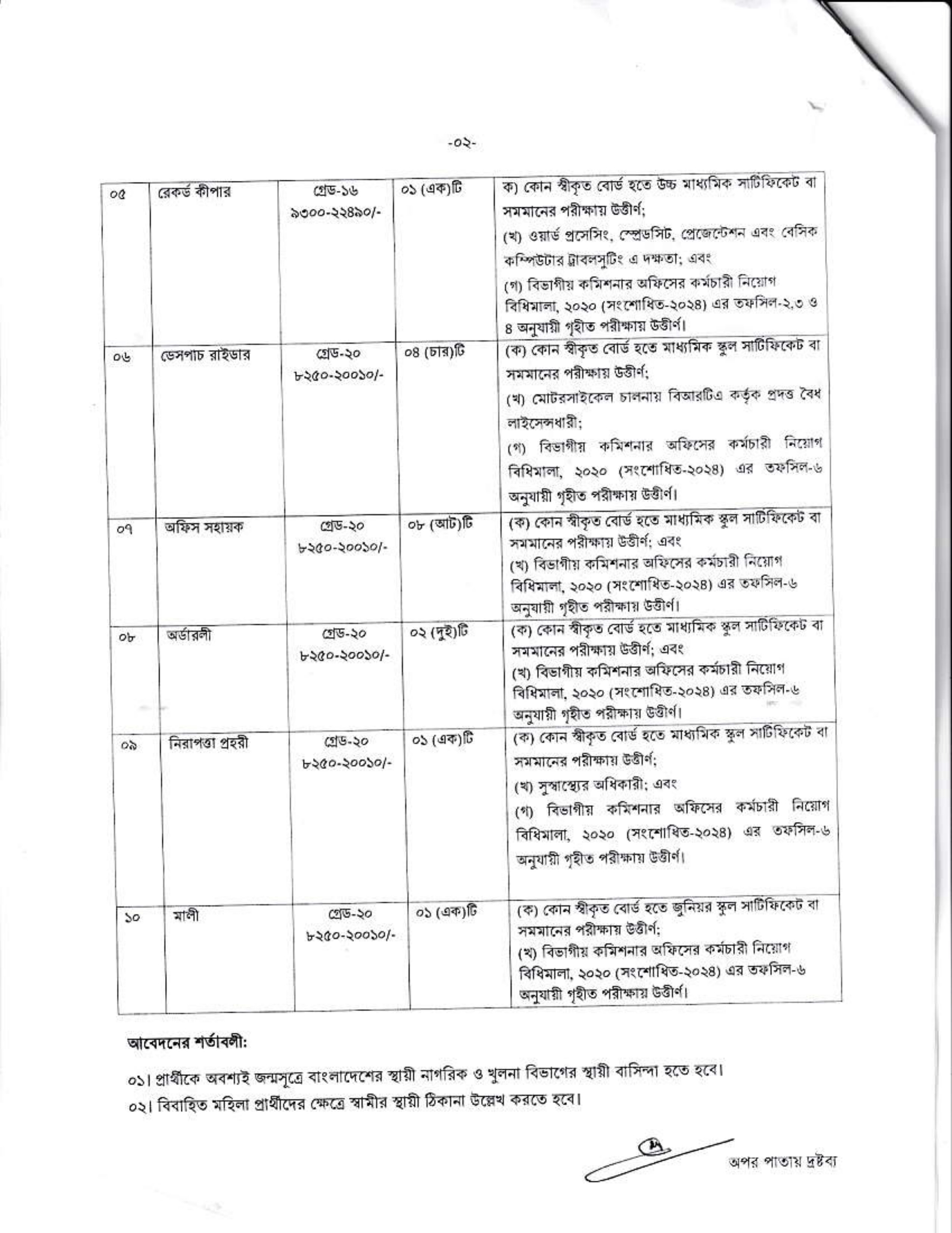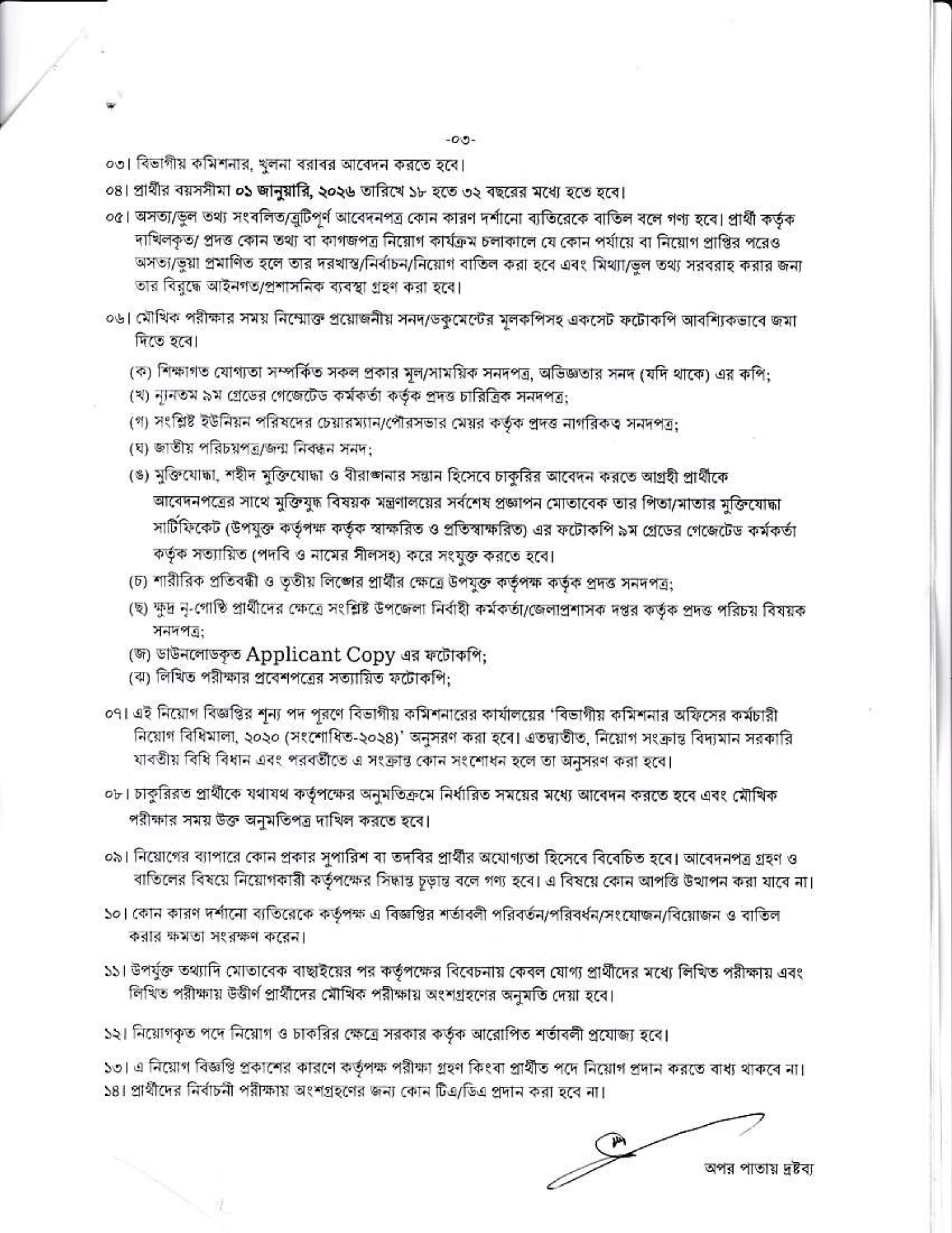 অন্যান্য শর্তাবলী: প্রার্থীকে অবশ্যই জন্মসূত্রে বাংলাদেশের নাগরিক এবং খুলনা বিভাগের স্থায়ী বাসিন্দা হতে হবে। বিবাহিত মহিলা প্রার্থীদের ক্ষেত্রে স্বামীর স্থায়ী ঠিকানা উল্লেখ করতে হবে।