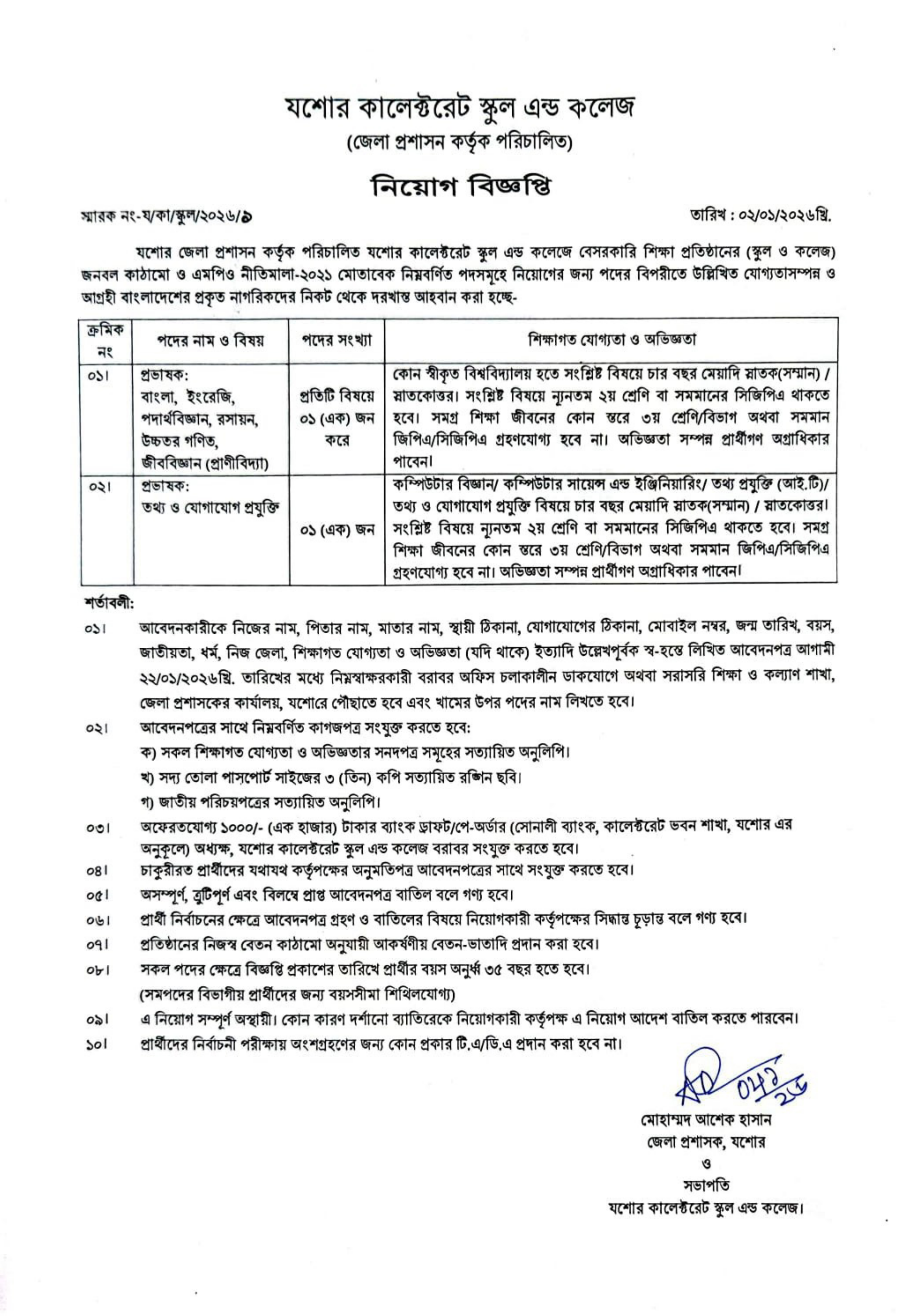 যশোর জেলা প্রশাসন কর্তৃক পরিচালিত যশোর কালেক্টরেট স্কুল এন্ড কলেজে বেসরকারি শিক্ষা প্রতিষ্ঠানের জনবল কাঠামো ও এমপিও নীতিমালা মোতাবেক জনবল নিয়োগের লক্ষ্যে বিজ্ঞপ্তি প্রকাশ করা হয়েছে। আগ্রহী ও যোগ্য প্রার্থীদের নির্ধারিত সময়ের মধ্যে ডাকযোগে অথবা সরাসরি আবেদন করার জন্য আহ্বান জানানো হচ্ছে।