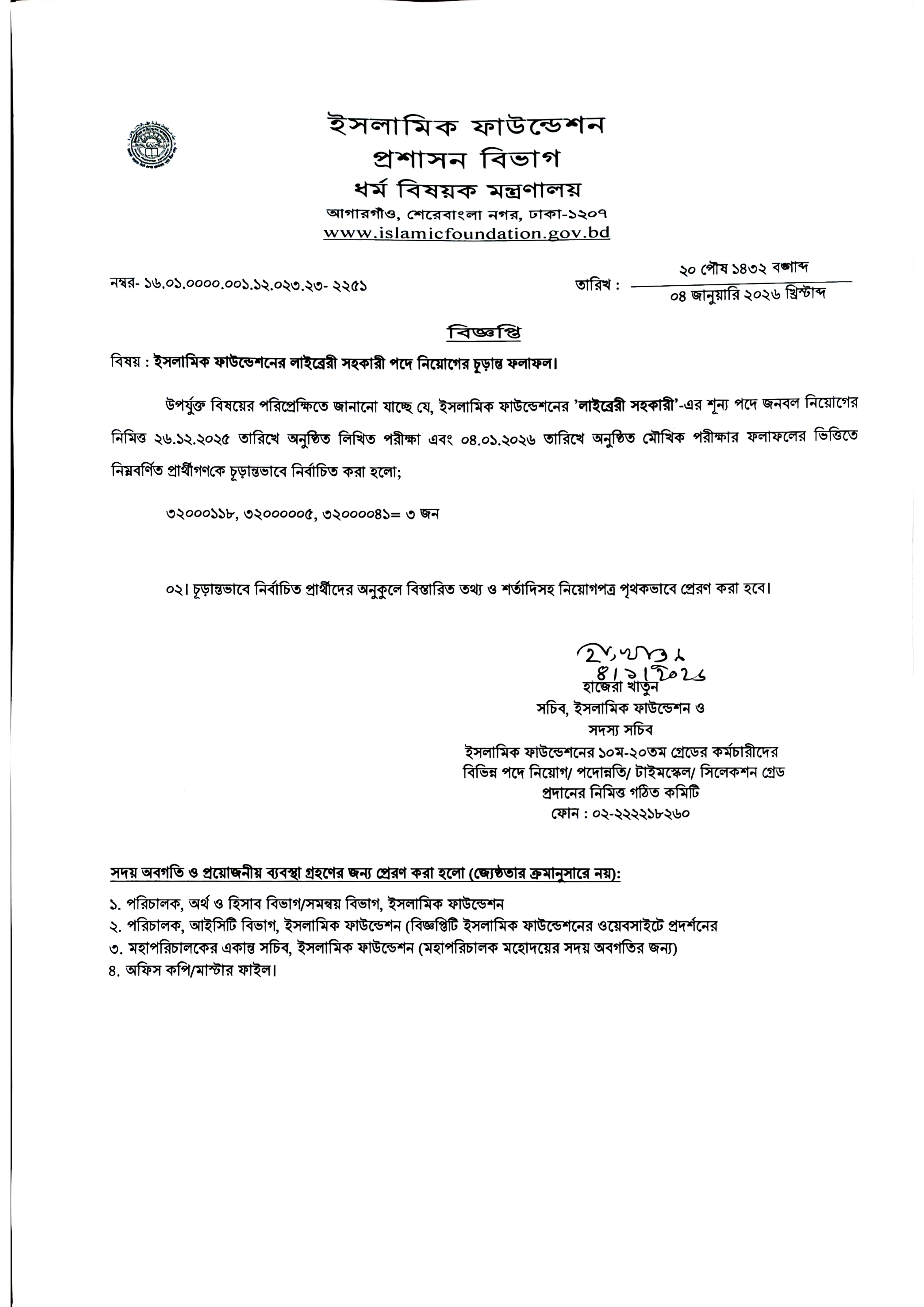 ইসলামিক ফাউন্ডেশনের নিয়োগ পরীক্ষার চূড়ান্ত ফলাফল প্রকাশিত হয়েছে। ধর্ম বিষয়ক মন্ত্রণালয়ের অধীন এই প্রতিষ্ঠানের বিভিন্ন পদে জনবল নিয়োগের লক্ষ্যে অনুষ্ঠিত লিখিত ও মৌখিক পরীক্ষার ভিত্তিতে চূড়ান্তভাবে নির্বাচিত প্রার্থীদের তালিকা প্রকাশ করা হয়েছে।