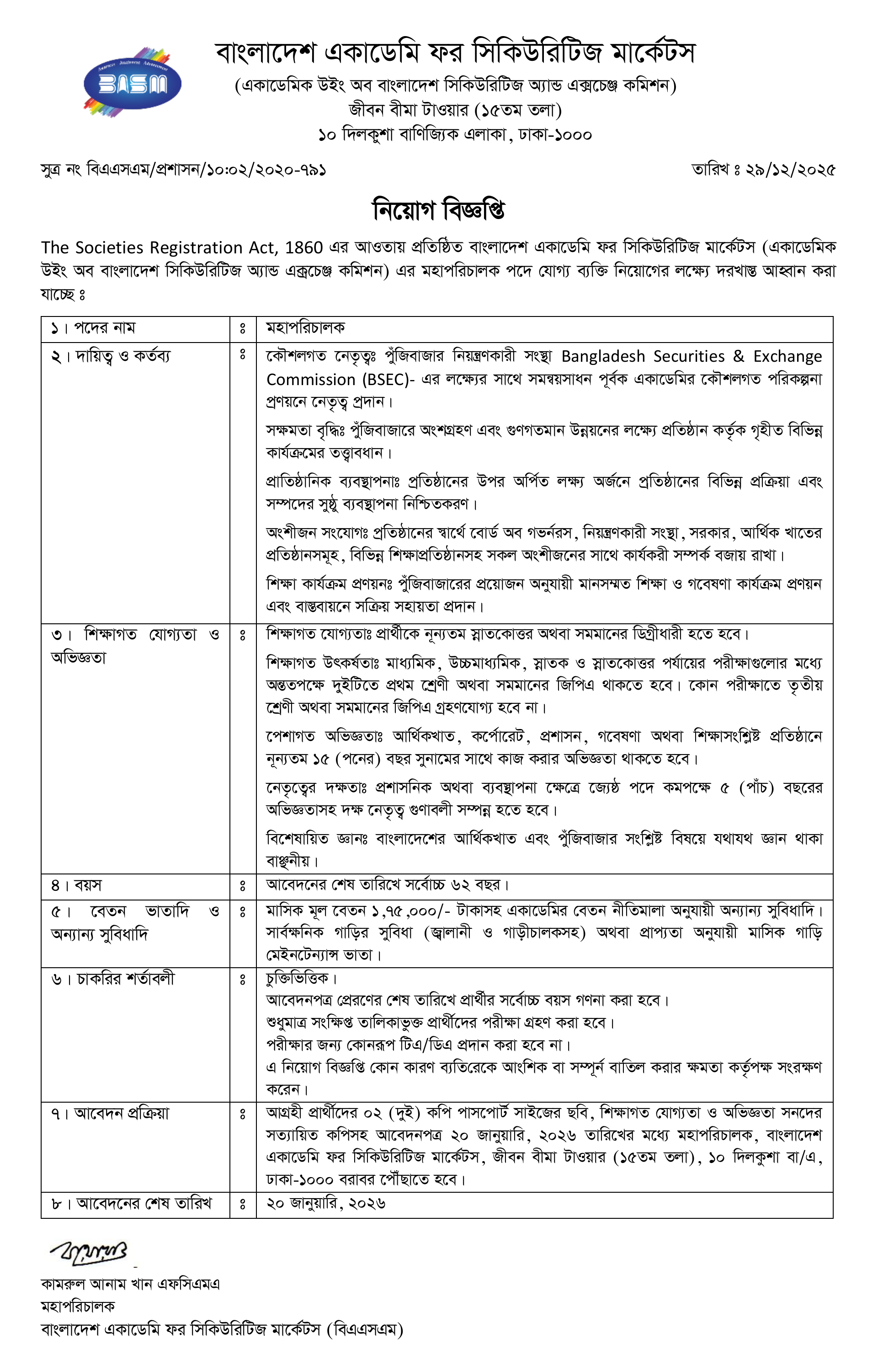 আগ্রহী প্রার্থীদের ২ কপি পাসপোর্ট সাইজের ছবি, শিক্ষাগত যোগ্যতা ও অভিজ্ঞতার সকল সনদের সত্যায়িত কপিসহ আবেদনপত্র ডাকযোগে বা সরাসরি নির্দিষ্ট ঠিকানায় পাঠাতে হবে। আবেদনের ঠিকানা: মহাপরিচালক, বাংলাদেশ একাডেমি ফর সিকিউরিটিজ মার্কেটস, জীবন বীমা টাওয়ার (১৫তম তলা), ১০ দিলকুশা বা/এ, ঢাকা-১০০০।