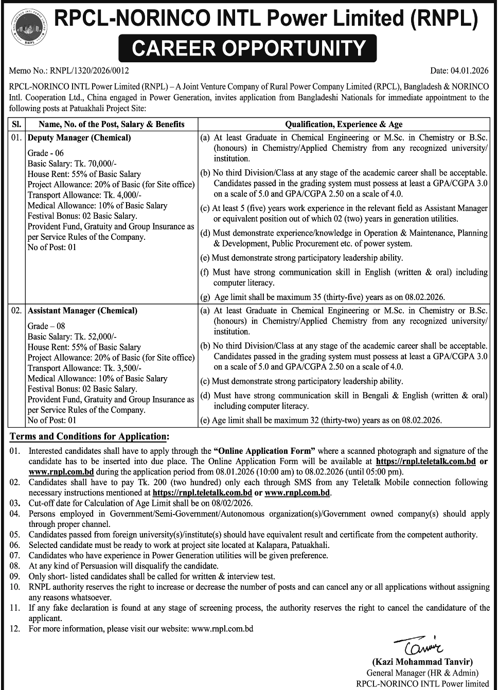 https://rnpl.teletalk.com.bd অথবা www.rnpl.com.bd - আবেদন শুরুর তারিখ: ০৮.০১.২০২৬ (সকাল ১০:০০ টা)।
