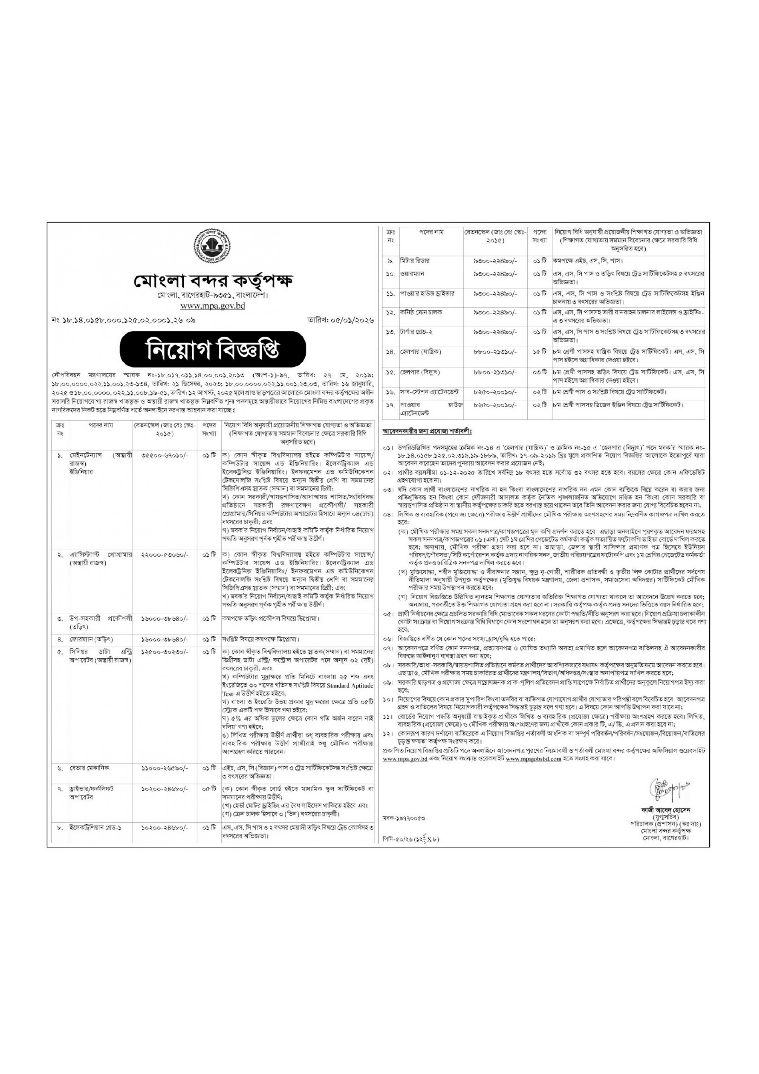 মোংলা বন্দর কর্তৃপক্ষের রাজস্ব খাতভুক্ত এবং অস্থায়ী রাজস্ব খাতভুক্ত একাধিক শূন্য পদে জনবল নিয়োগের জন্য বিশাল নিয়োগ বিজ্ঞপ্তি প্রকাশিত হয়েছে। আগ্রহী যোগ্য প্রার্থীদের অনলাইনে আবেদনের জন্য আহ্বান জানানো হয়েছে।