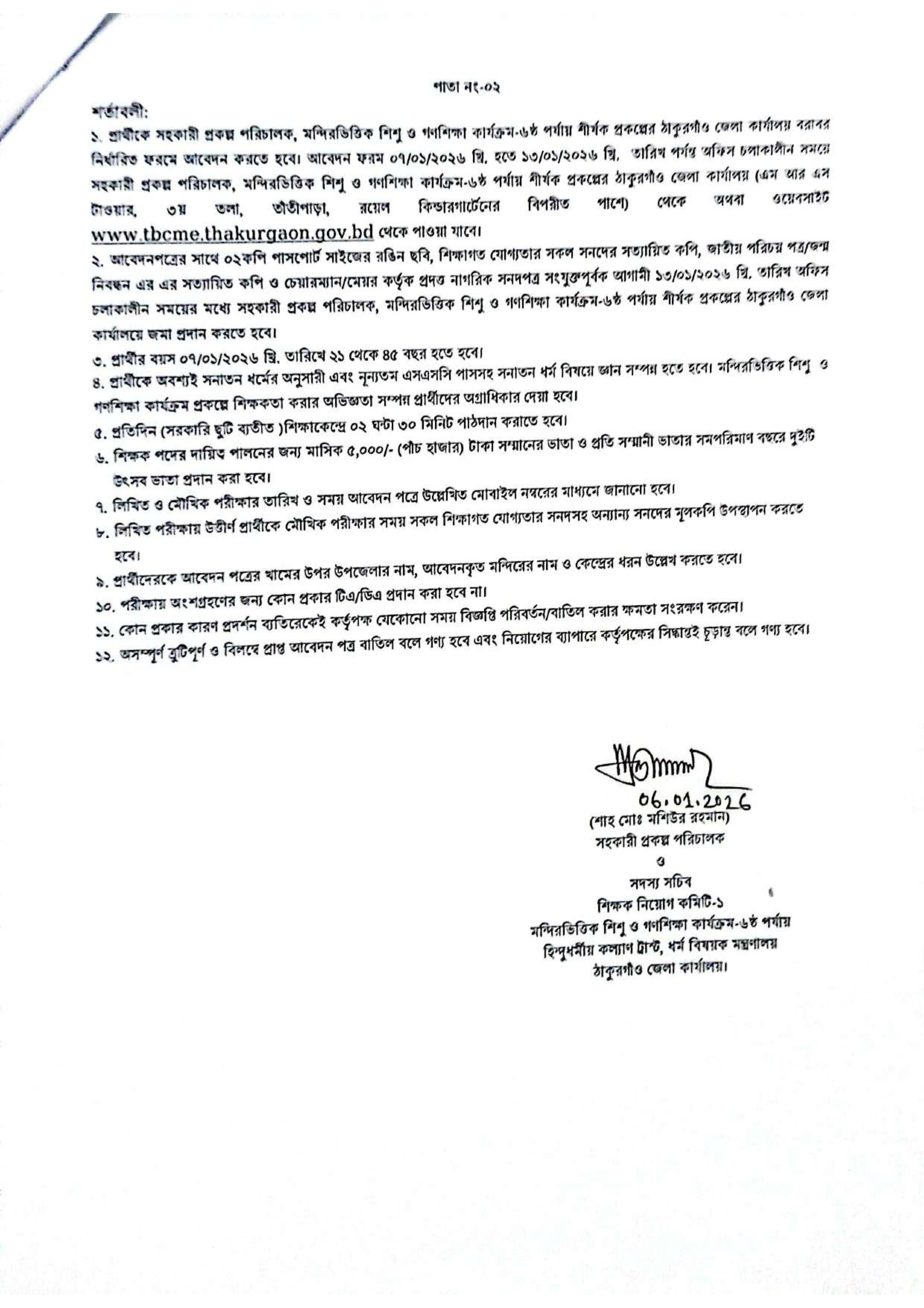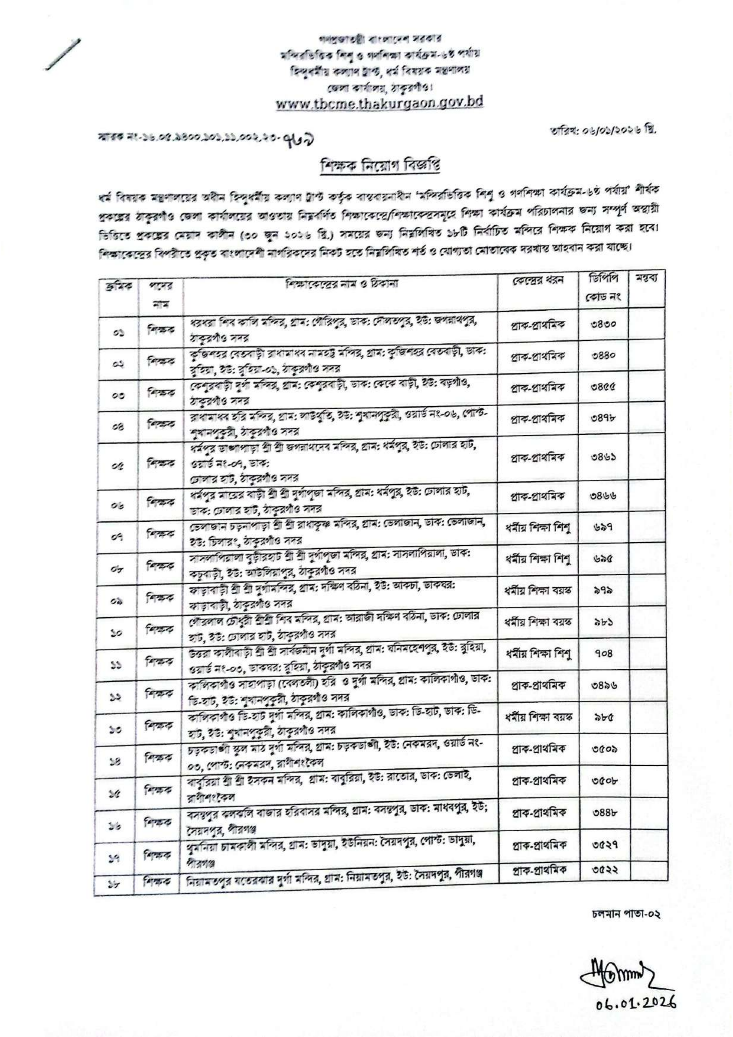 ধর্ম বিষয়ক মন্ত্রণালয়ের হিন্দুধর্মীয় কল্যাণ ট্রাস্ট কর্তৃক বাস্তবায়নাধীন ‘মন্দিরভিত্তিক শিশু ও গণশিক্ষা কার্যক্রম-৬ষ্ঠ পর্যায়’ প্রকল্পের আওতায় ঠাকুরগাঁও জেলা কার্যালয়ে শিক্ষক নিয়োগের বিজ্ঞপ্তি প্রকাশিত হয়েছে। ঠাকুরগাঁও জেলার ১৮টি নির্বাচিত মন্দিরে এই নিয়োগ প্রদান করা হবে।