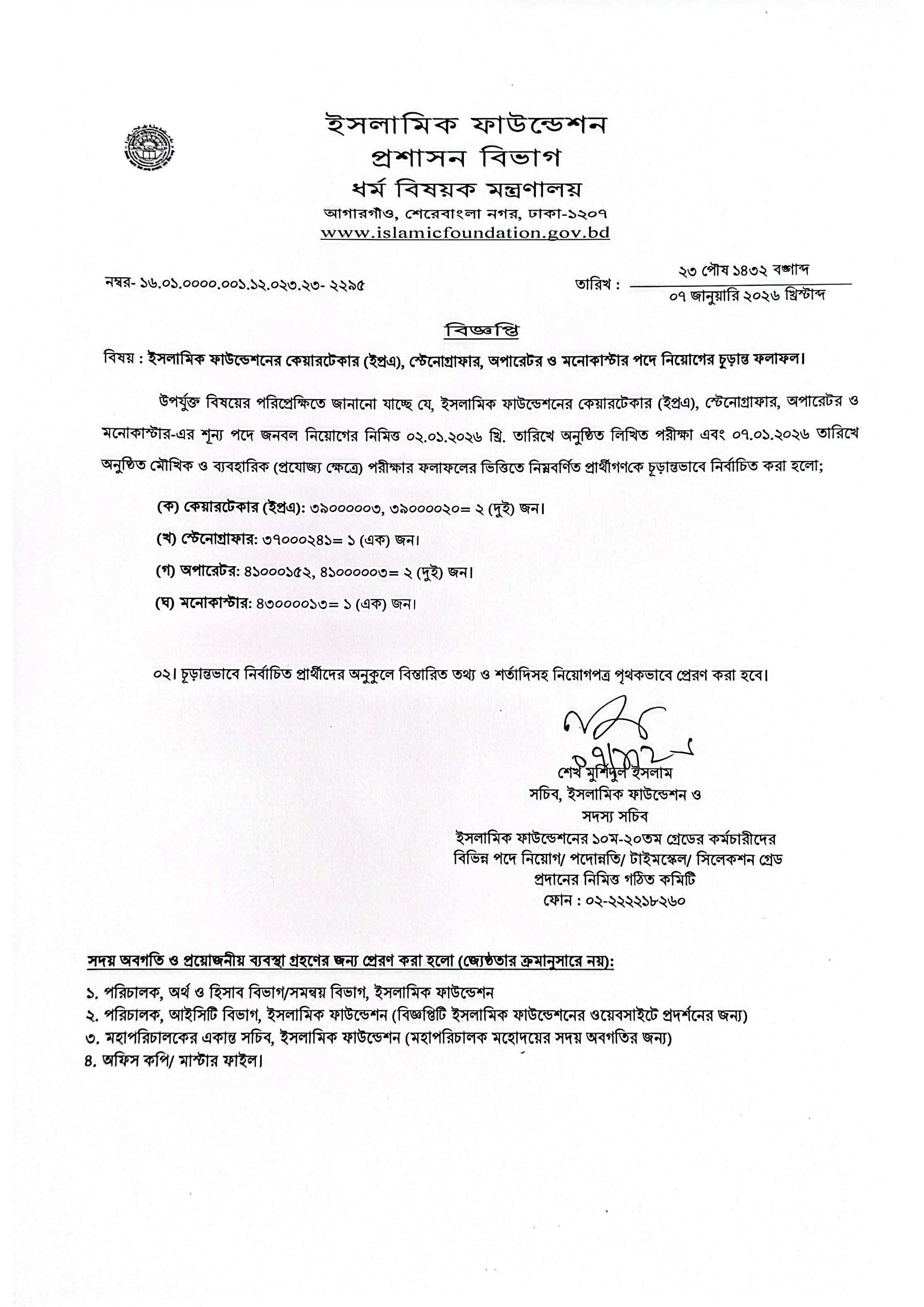 ইসলামিক ফাউন্ডেশনের অধীনে বিভিন্ন শূন্য পদে জনবল নিয়োগের লক্ষ্যে অনুষ্ঠিত লিখিত, মৌখিক ও ব্যবহারিক পরীক্ষার ভিত্তিতে চূড়ান্ত ফলাফল প্রকাশ করা হয়েছে। গত ০২ জানুয়ারি ২০২৬ তারিখে অনুষ্ঠিত লিখিত পরীক্ষা এবং ০৭ জানুয়ারি ২০২৬ তারিখে অনুষ্ঠিত মৌখিক ও ব্যবহারিক পরীক্ষার ফলাফলের ভিত্তিতে যোগ্য প্রার্থীদের সাময়িকভাবে নির্বাচিত করা হয়েছে।