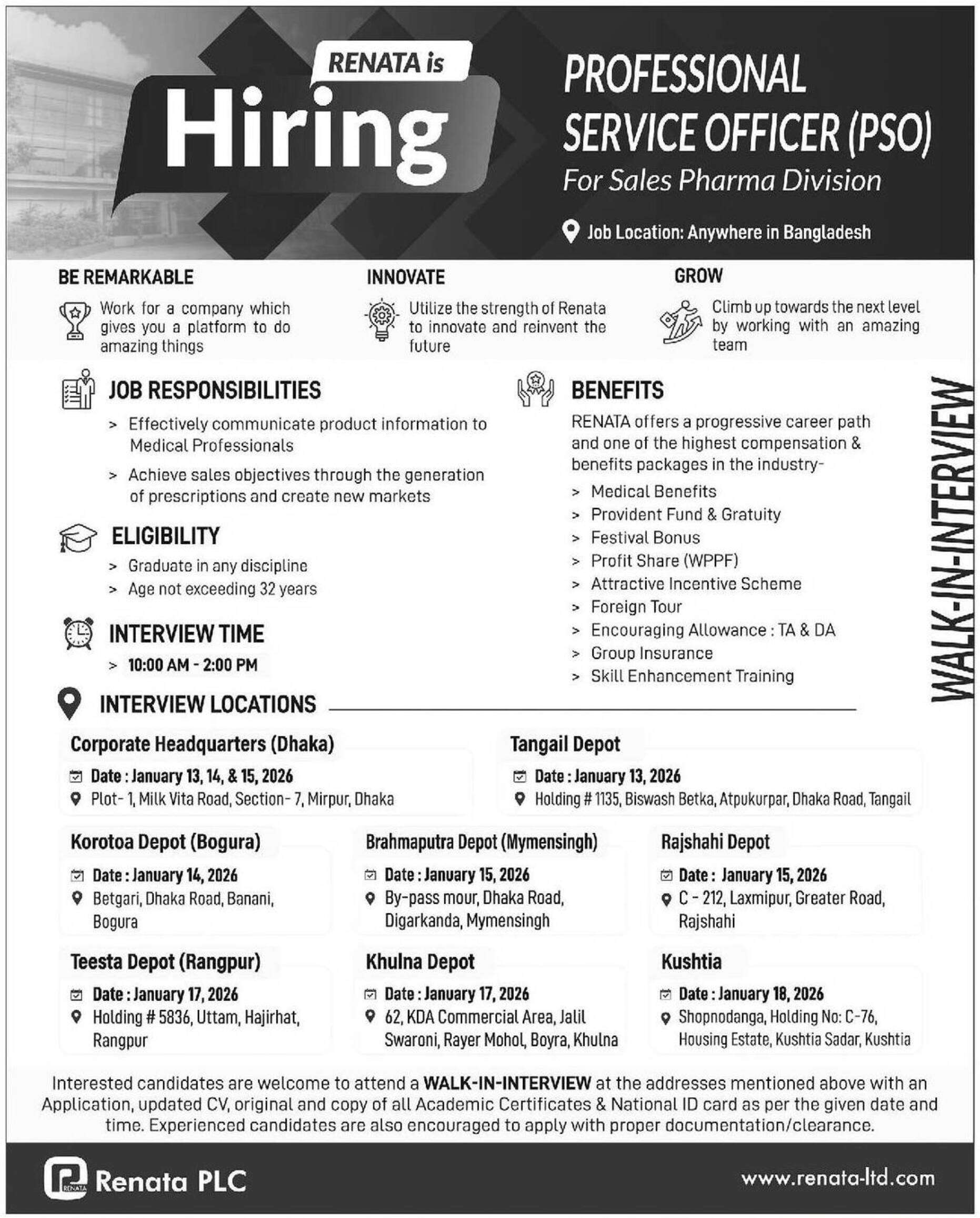 রেনাটা পিএলসি তাদের Sales Pharma Division-এর জন্য প্রফেশনাল সার্ভিস অফিসার (PSO) পদে জনবল নিয়োগ দিচ্ছে।
