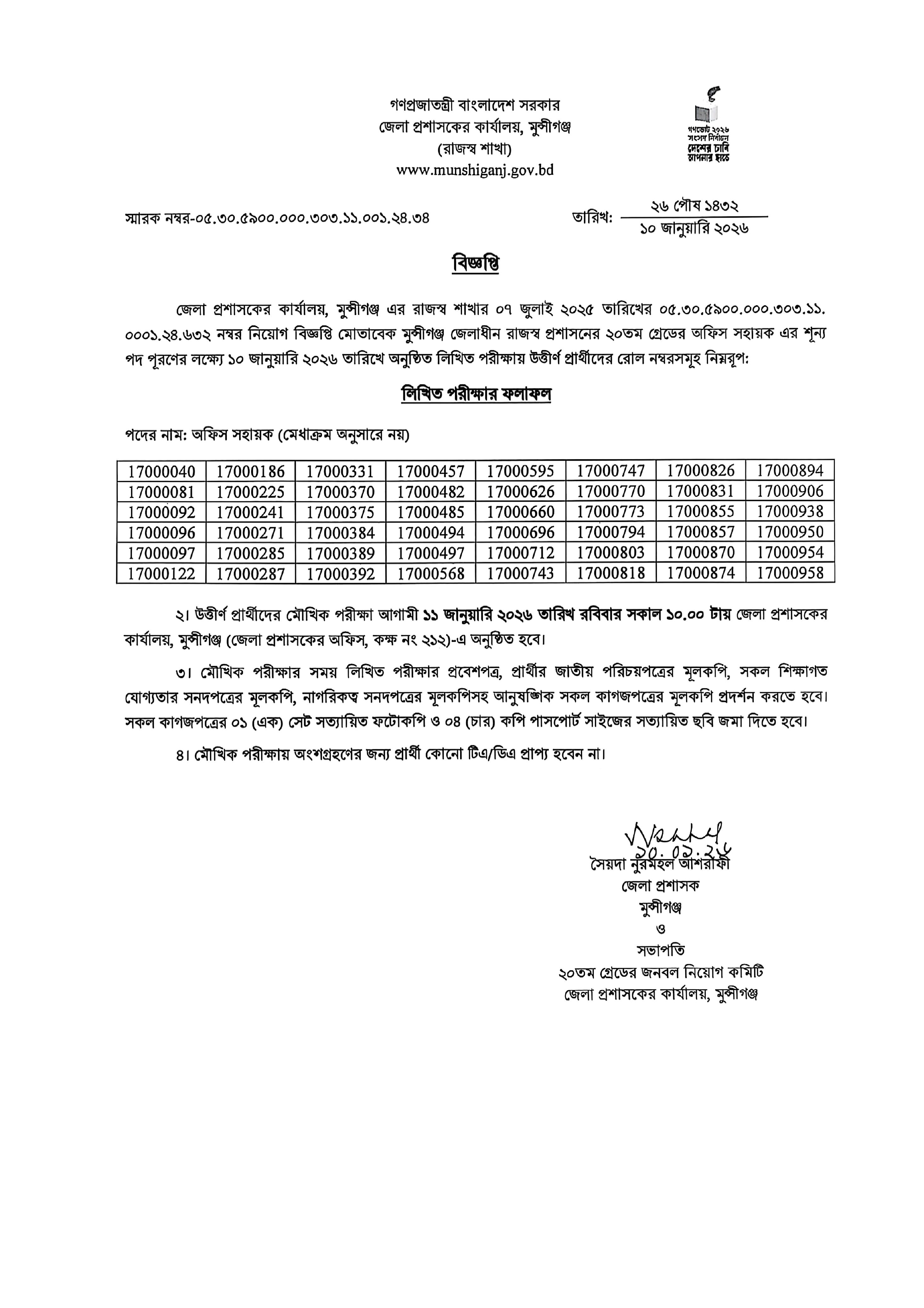 পরীক্ষার স্থান: জেলা প্রশাসকের কার্যালয়, মুন্সীগঞ্জ (জেলা প্রশাসকের অফিস, কক্ষ নং ২১২)