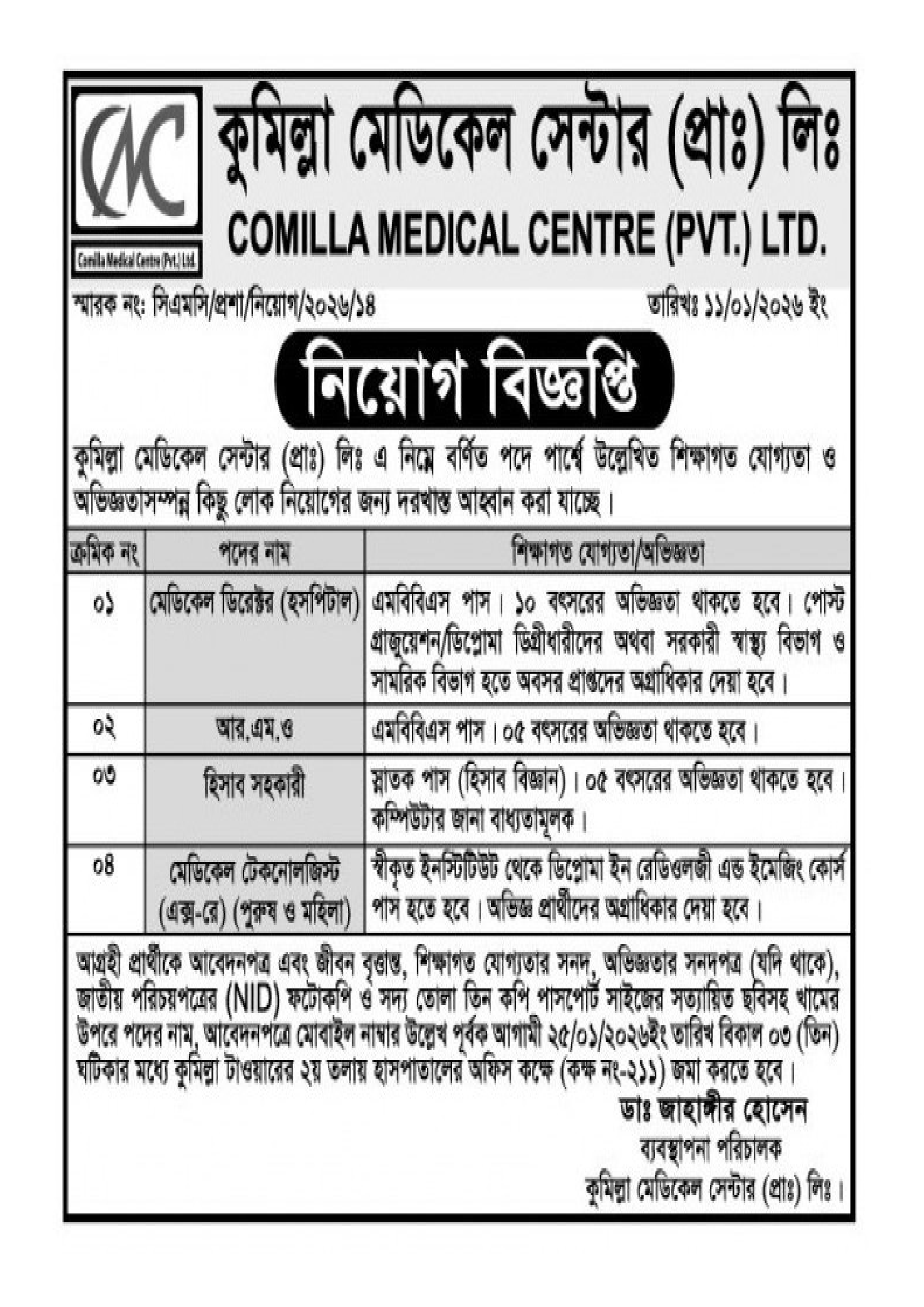 কুমিল্লা মেডিকেল সেন্টার (প্রাঃ) লিঃ বিভিন্ন পদে জনবল নিয়োগের জন্য বিজ্ঞপ্তি প্রকাশ করেছে। আগ্রহী যোগ্য প্রার্থীদের কাছ থেকে দরখাস্ত আহ্বান করা হচ্ছে।