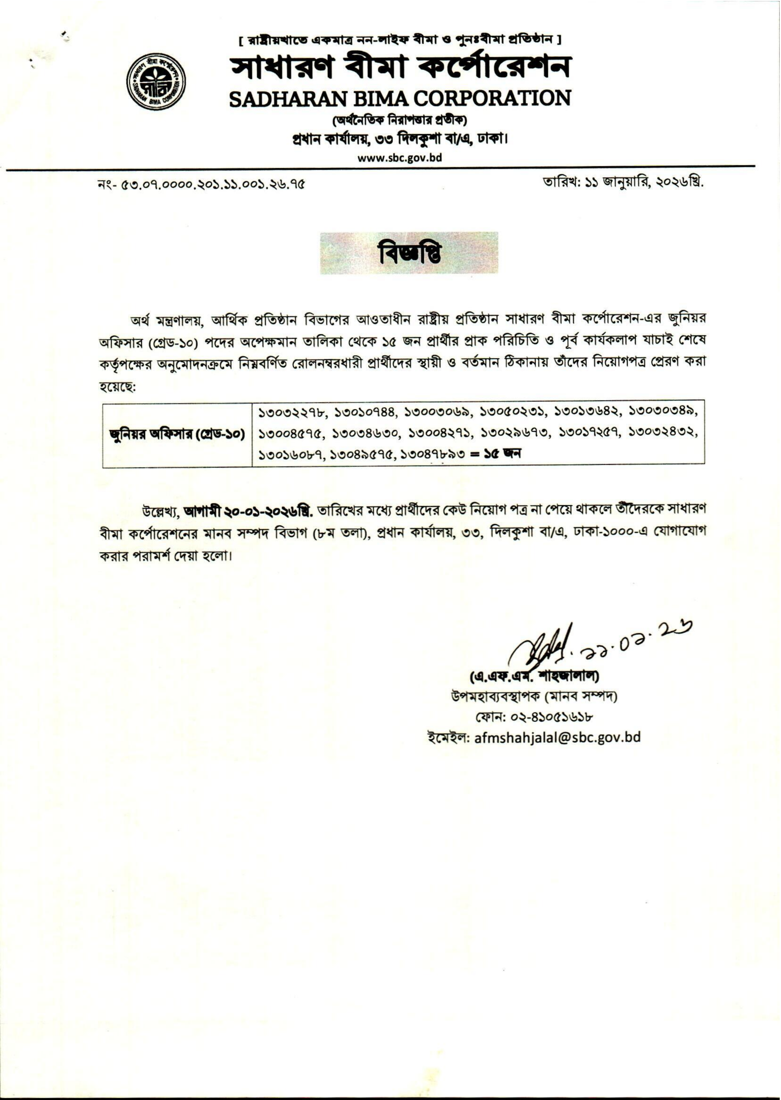 অর্থ মন্ত্রণালয়ের আর্থিক প্রতিষ্ঠান বিভাগের অধীনস্থ সাধারণ বীমা কর্পোরেশনের জুনিয়র অফিসার (গ্রেড-১০) পদের অপেক্ষমান তালিকা থেকে চূড়ান্তভাবে নির্বাচিত প্রার্থীদের নিয়োগপত্র প্রেরণ করা হয়েছে। প্রাক পরিচিতি ও পূর্ব কার্যকলাপ যাচাই শেষে কর্তৃপক্ষের অনুমোদনক্রমে নির্বাচিত ১৫ জন প্রার্থীর বর্তমান ও স্থায়ী ঠিকানায় ডাকযোগে এই নিয়োগপত্র পাঠানো হয়েছে।