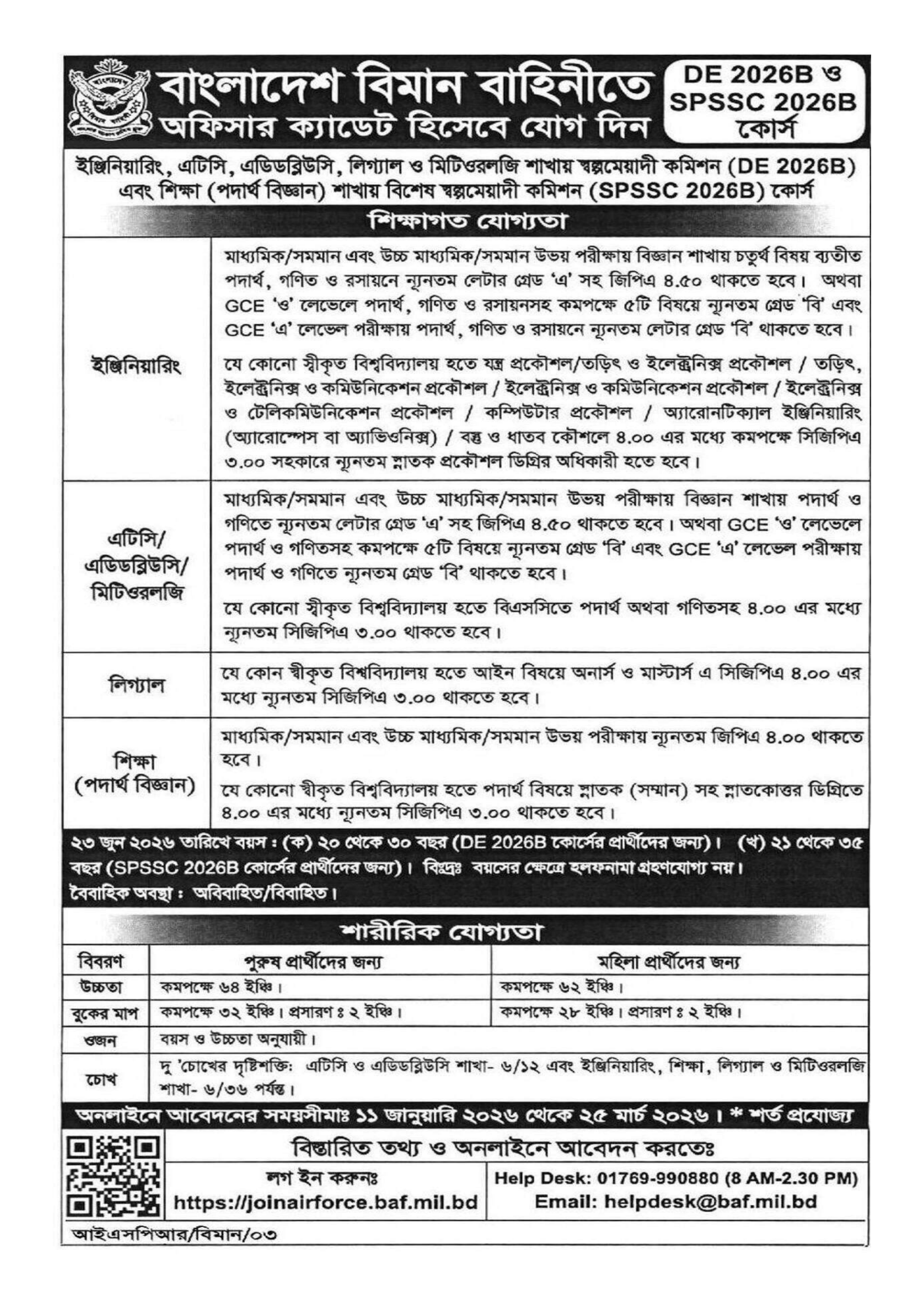 বাংলাদেশ বিমান বাহিনীতে স্বল্পমেয়াদী কমিশন (DE 2026B) এবং বিশেষ স্বল্পমেয়াদী কমিশন (SPSSC 2026B) কোর্সে অফিসার পদে নিয়োগের জন্য বিজ্ঞপ্তি প্রকাশ করা হয়েছে। আগ্রহী যোগ্য প্রার্থীরা অনলাইনে আবেদন করতে পারবেন।